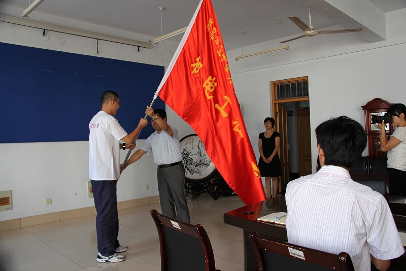 教务处处长朱连勤老师为机电学院“传播知识∙传递温暖”公益服务团授旗,随后,校团委书记初磊老师宣布“机电工程学院‘传播知识∙传递温暖’公益服务团出发”,本次仪式进入尾声。