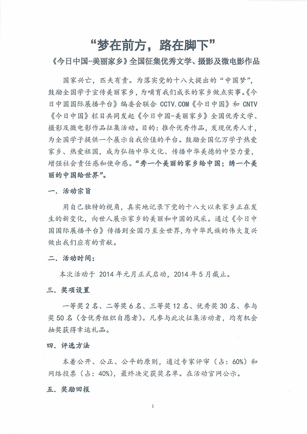 【转发】“梦在前方,路在脚下”《今日中国—美丽家乡》全国征集优秀文学、摄影及微电影作品