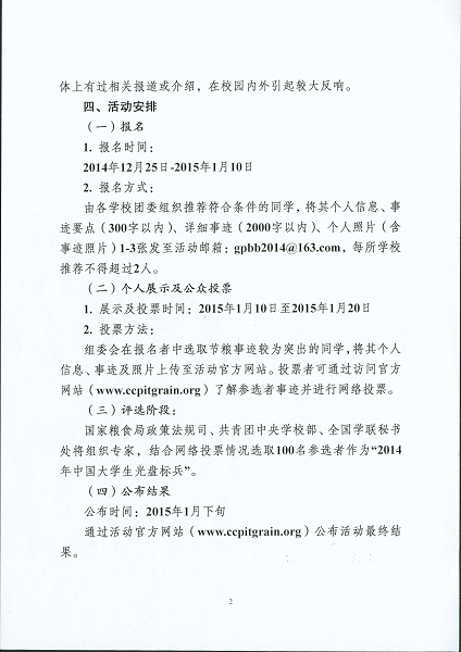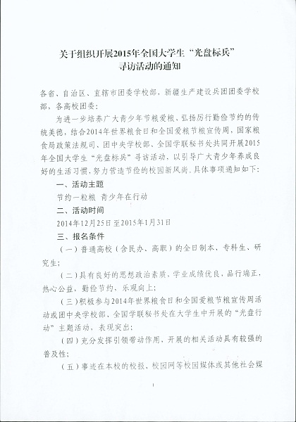 现将《关于组织开展2015年全国大学生“光盘标兵”寻访活动的通知》转发给你们,请根据通知要求推荐符合条件的学生参与评选。请于1月7日前,将推荐学生的相关信息电子版发送至校团委邮箱(qdndtw@163.com),每学院推荐1人。