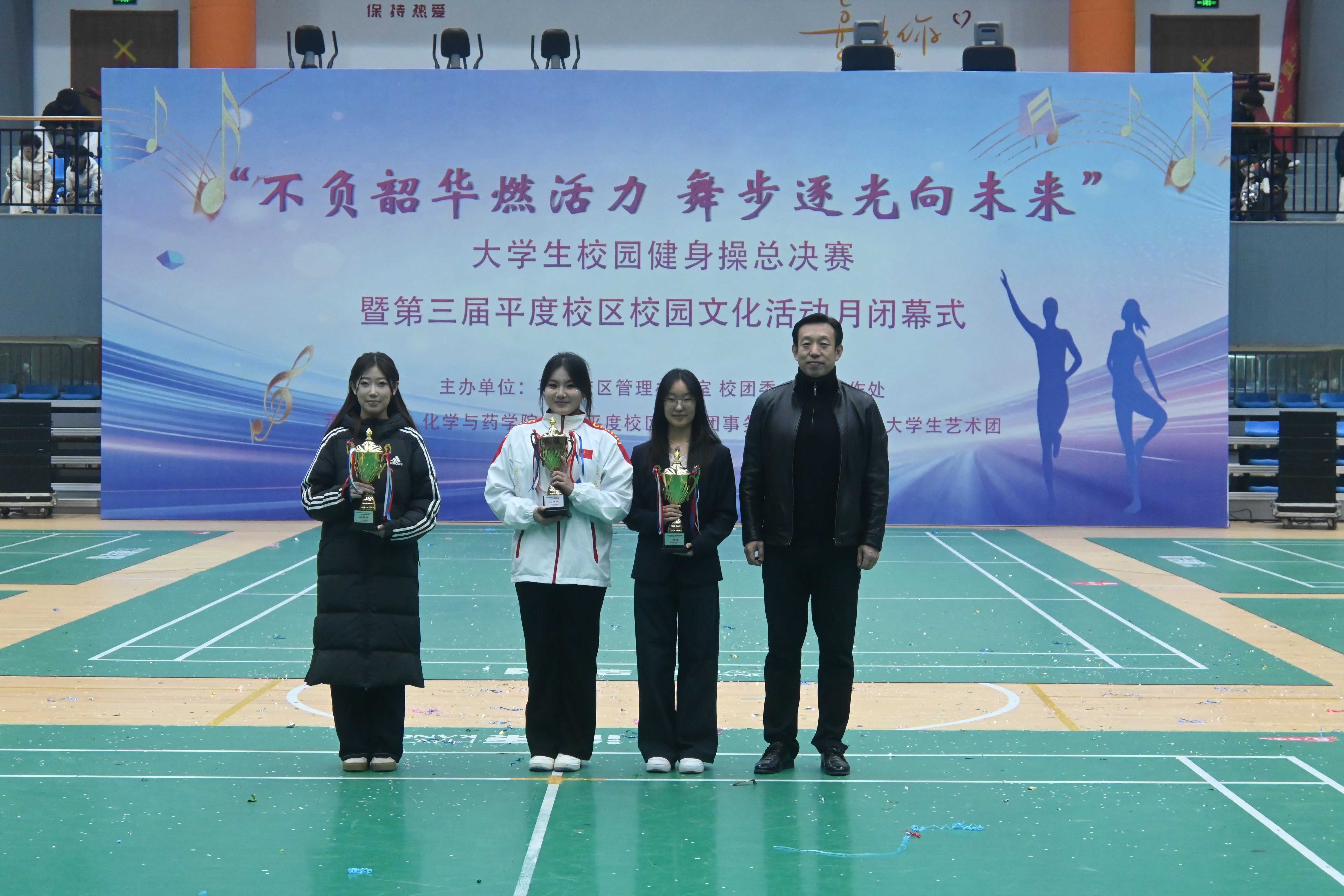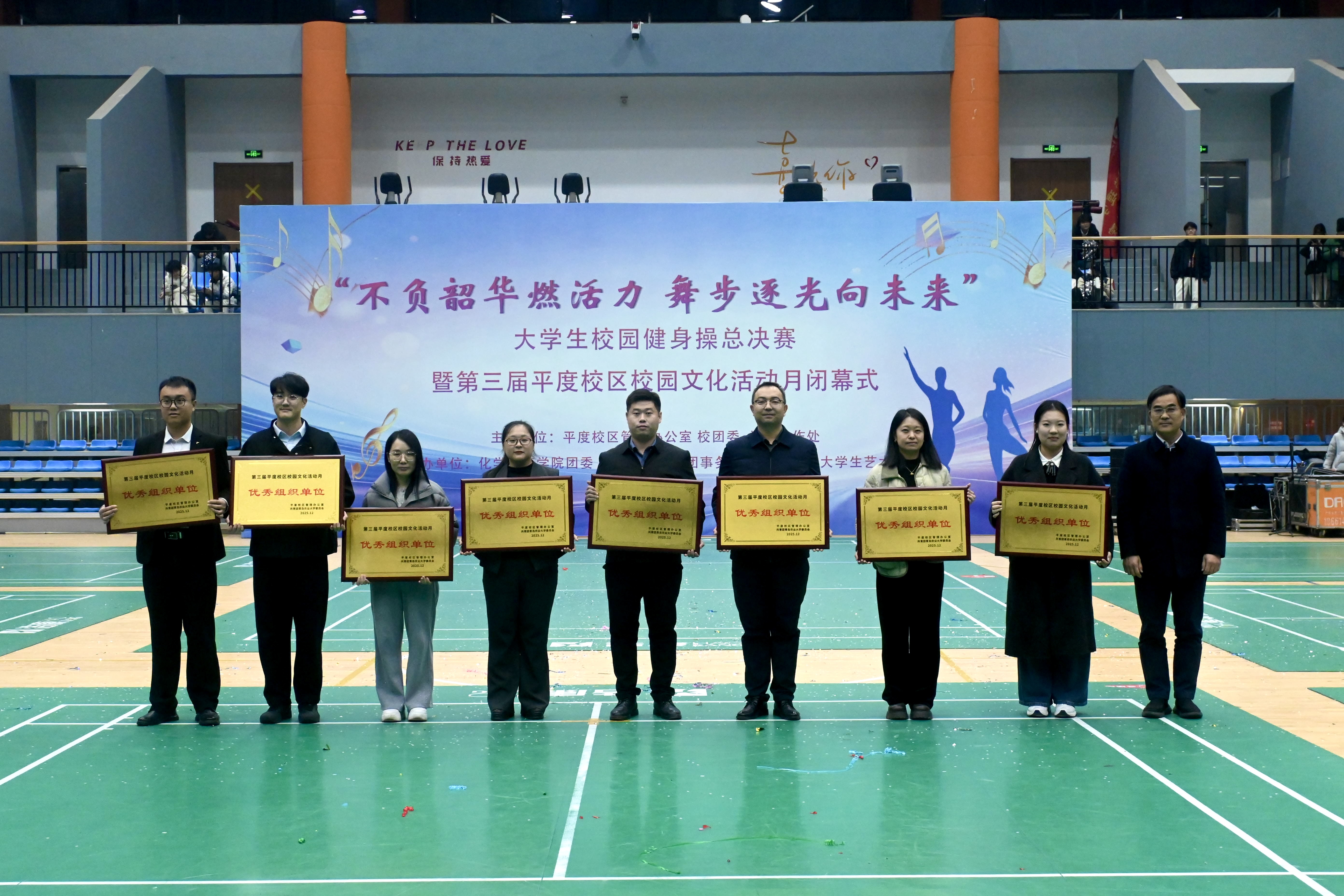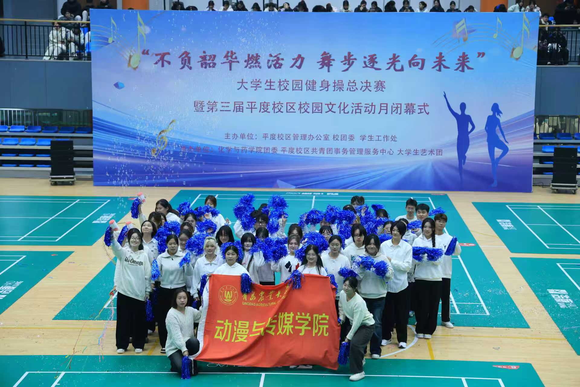12月19日,“不负韶华燃活力,舞步逐光向未来”大学生校园健身操总决赛暨第三届平度校区校园文化活动月闭幕式于平度校区朝阳体育馆顺利举行。学生工作处、平度校区管理办公室、校团委、体育教学部、承办学院相关负责同志,以及各学院辅导员代表、学生代表参加。