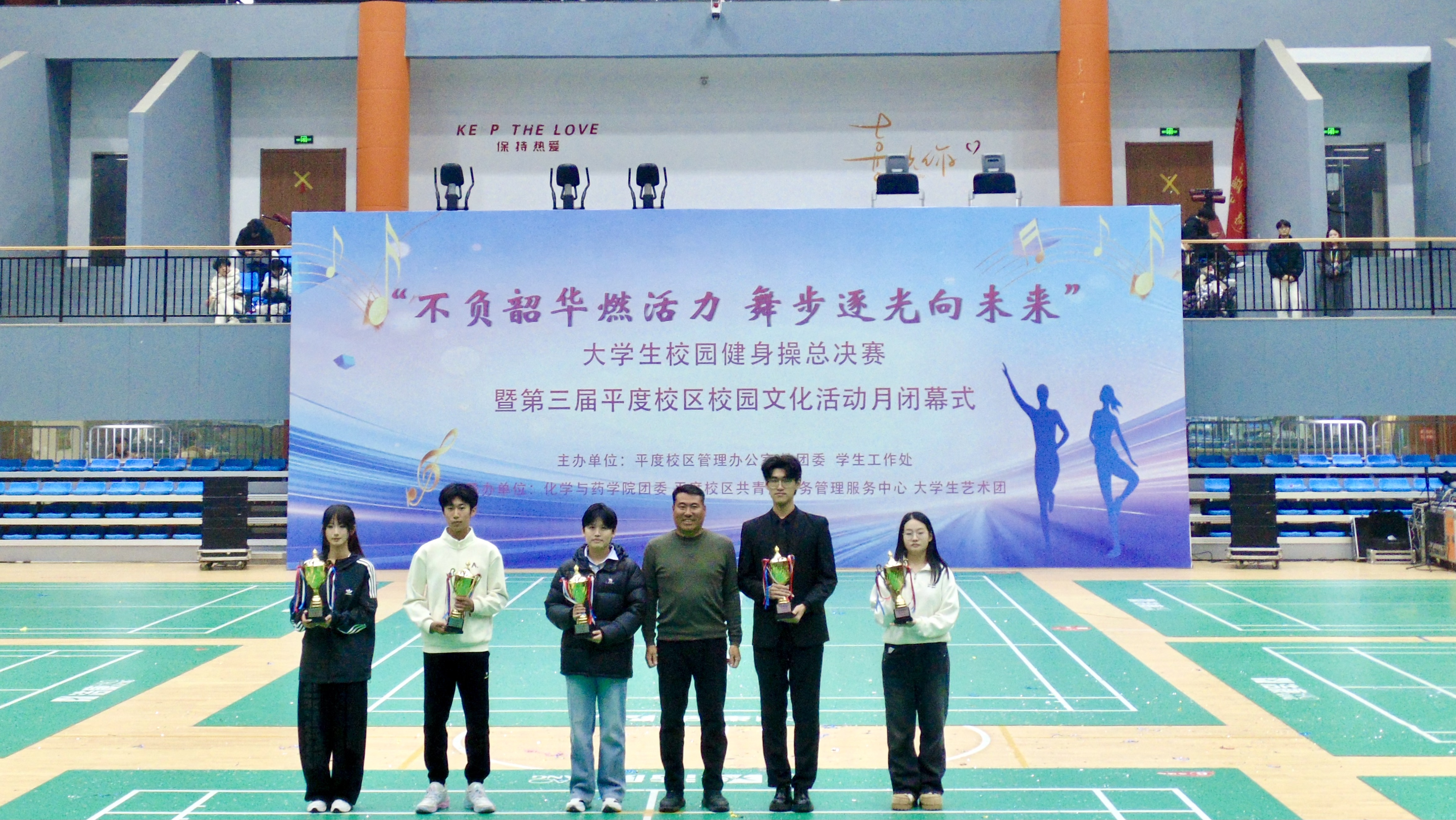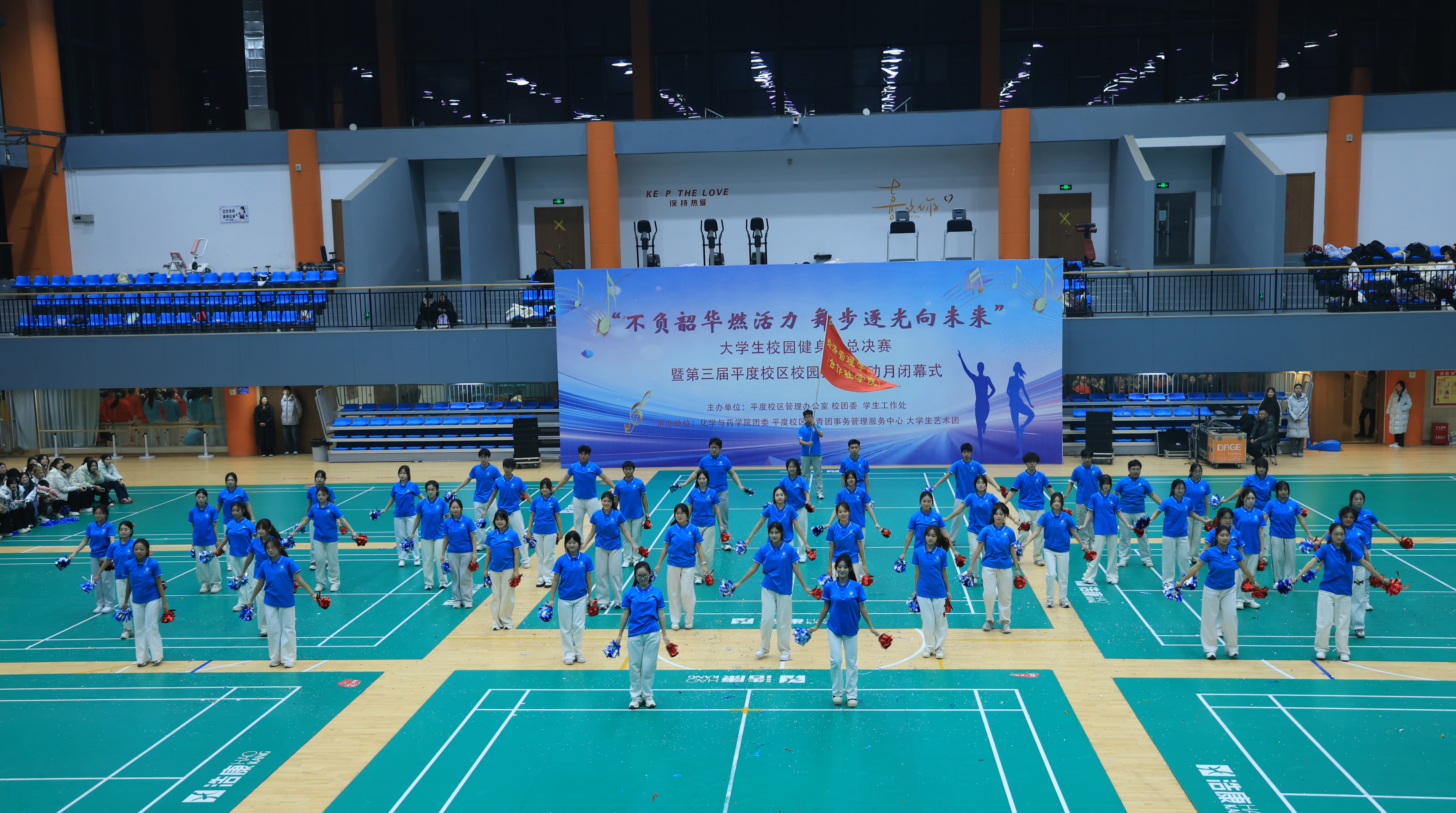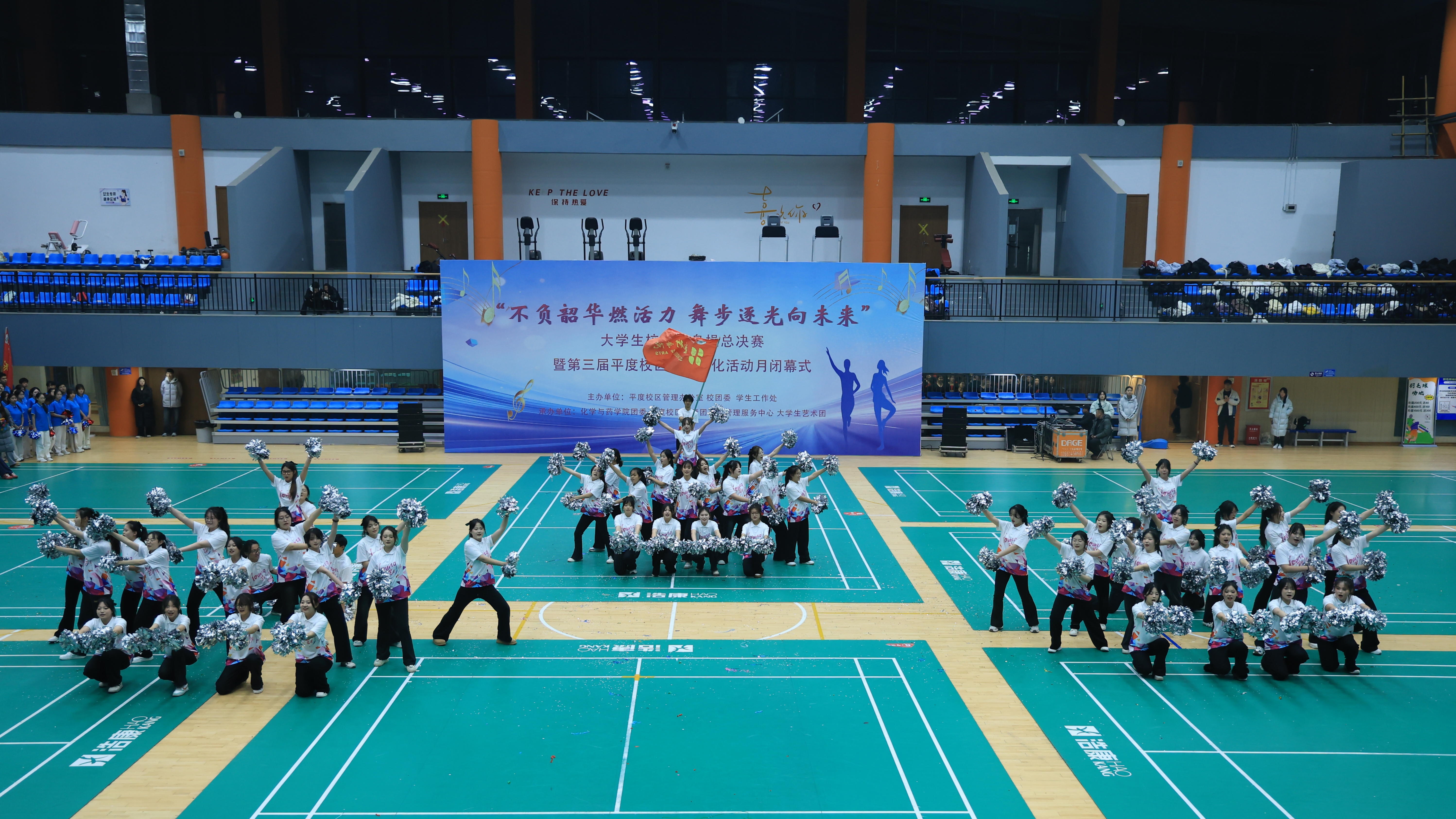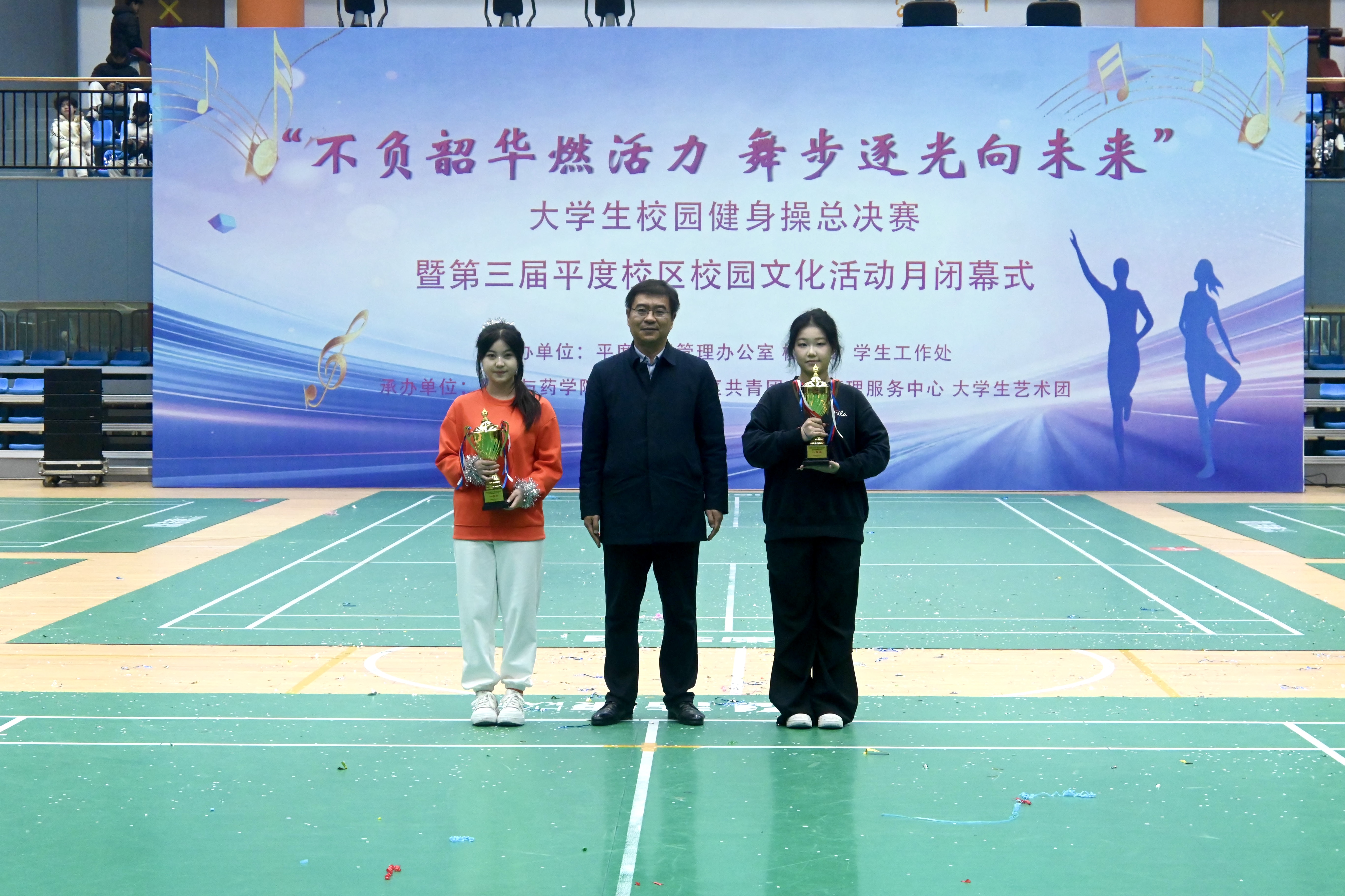 12月19日,“不负韶华燃活力,舞步逐光向未来”大学生校园健身操总决赛暨第三届平度校区校园文化活动月闭幕式于平度校区朝阳体育馆顺利举行。学生工作处、平度校区管理办公室、校团委、体育教学部、承办学院相关负责同志,以及各学院辅导员代表、学生代表参加。