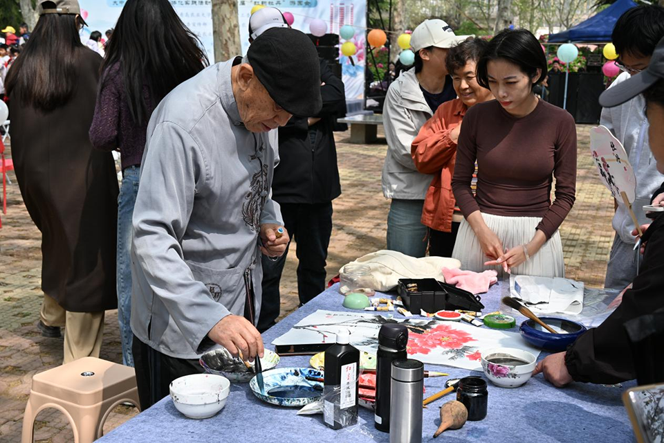 活动现场暖意融融、人潮涌动,各类特色活动轮番上演、精彩纷呈。合唱《上春山》朝气满满,舞蹈《春和景明》舞姿翩跹,青岛东川路小学学生带来的香艺表演《篆香雅韵》尽显中华香道的静雅与深邃,民乐合奏《花开似锦》与盛放的牡丹相映成趣;《烟雨行舟》《铁血丹心》《锦绣华裳》等节目依次亮相,将国风雅韵演绎得淋漓尽致,让师生在视听盛宴中感受传统文化的独特魅力。牡丹观赏区内,马克思主义学院教师与大学生文明礼仪宣讲团成员化身牡丹使者,为师生娓娓讲述牡丹背后的传统文化故事与国粹经典。社团互动区墨香与花香交织,师生们品花糕、学茶艺、研书法,体验压花书签、飞花令、投壶等传统游艺;园艺学院设置“插花DIY”专区,食品科学与工程学院邀师生共品独创特色花糕,让味蕾与花香共舞。美育展示区,退休教职工、非遗传承人与学子共创的牡丹主题书画剪纸,传递匠心美韵。郁金香展示区灿若云霞,与牡丹高低错落,相映成趣,师生们在花香氤氲中识卉悟美、亲近自然。