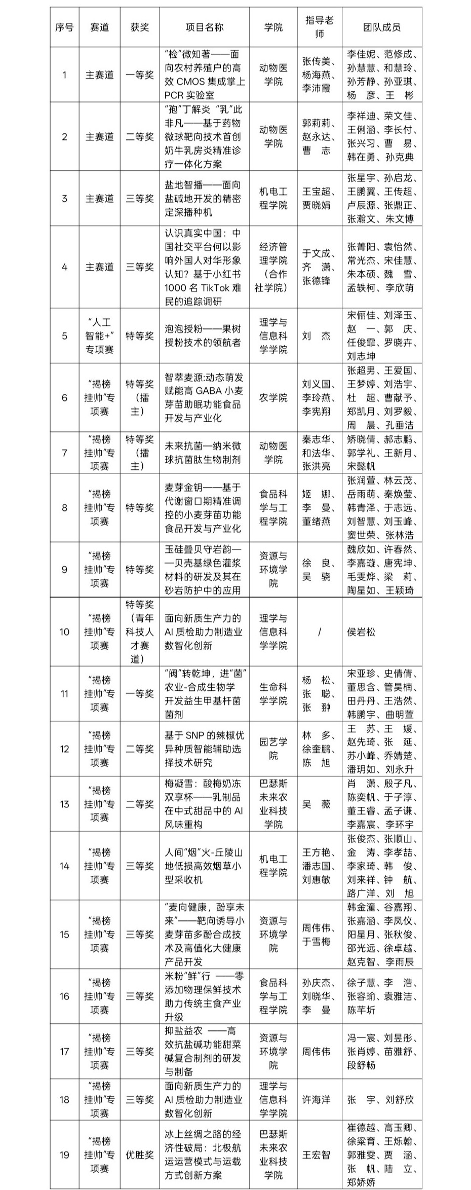 在十九届“挑战杯”揭榜挂帅专项赛中,农学院刘义国老师、李玲燕老师、李宪翔老师指导,张超男等同学完成的《智萃麦源:动态萌发赋能高GABA小麦芽苗助眠功能食品开发》荣获特等奖、“擂主”,动物医学院秦志华老师、和法华老师指导,矫晓倩等同学完成的《未来抗菌-纳米微球抗菌肽生物制剂》荣获特等奖、“擂主”,食品科学与工程学院姬娜老师、李曼老师、董绪燕老师指导,张润萱等同学完成的项目《麦芽金钥——基于代谢窗口期精准调控的小麦芽苗功能食品开发与产业化》荣获特等奖,资源与环境学院徐良老师、吴骁老师指导,魏欣如等同学完成的项目《玉硅叠贝守岩韵——贝壳基绿色灌浆材料的研发及其在砂岩防护中的应用》荣获特等奖,理学与信息科学学院许海洋指导,张宇等同学完成的项目《面向新质生产力的AI质检助力制造业数智化创新》荣获青年科技人才赛道特等奖。