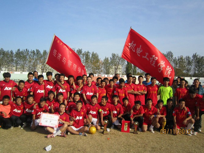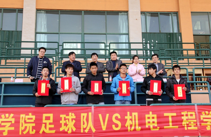 11月9日中午,青岛农业大学第八届“青农杯”足球赛决赛在学校五环体育场举行。校学工部部长、学生处处长慕乾伟,体育教学部主任李国梁、副主任吴秀云,校团委书记初磊、副书记王峰、文体部部长李勒,经济与管理学院党委副书记焦磊,机电工程学院党委副书记孙景福在主席台就坐,经济与管理学院代表队和机电工程学院代表队给现场观众带来了一场精彩的巅峰之战。