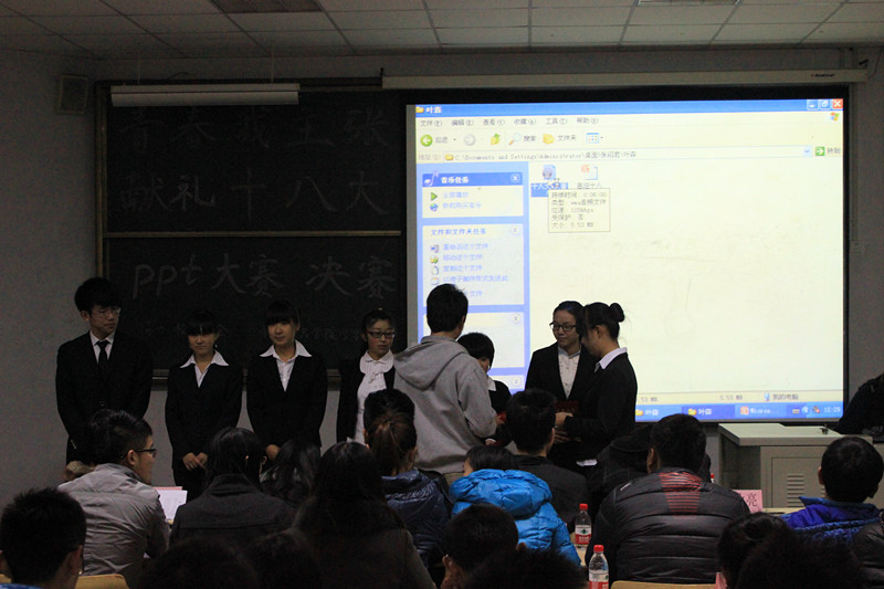 为积极引导广大学生学习领会党的十八大精神,丰富广大团员青年的课余生活, 11月30日晚,由校学生会主办,食品科学与工程学院学生会承办的“青春我主张,献礼十八大”PPT大赛决赛在教学区B301举行。担任本次比赛的评委嘉宾包括校学生会常务副主席孙延刚、郑元,校社团联合会主席龚鲜侠,各学院学生会主席以及校学生会各部部长。特别邀请具有丰富PPT制作经验的四位学生导师参与评选。