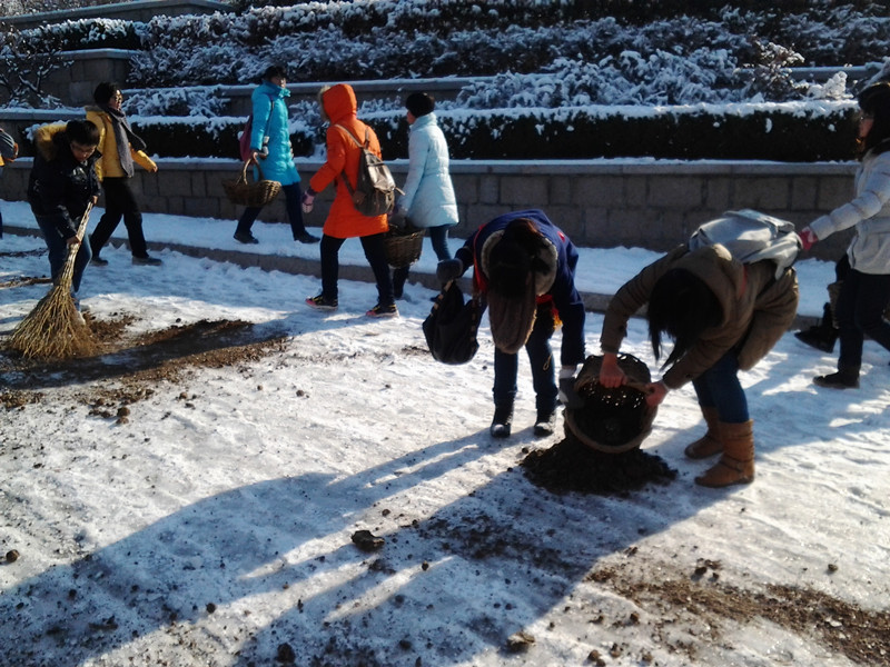 严寒暴雪挡不住志愿者的热情,哪里有需要哪里就有志愿者的身影。志愿者们用自己微笑服务、诚挚奉献,谱写了迎接新年青岛农大校园最美丽的图景。恰逢考试周,很多同学刚刚结束考试,才下“考场”又上“战场”。随着清扫工作的进行,气温逐渐降低,结冰的路面给清理工作带来很大的困难。但大家干劲十足,通力合作,扛着铁锹、扫帚,不畏严寒地在各自的责任区内清理路面残留积雪。清除冰块、覆盖沙土,安全有序地认真做好清除冰雪的工作。志愿者们的行动感染了经过的学生,大家纷纷向志愿者竖起大拇指,并积极的加入到清扫队伍中来。