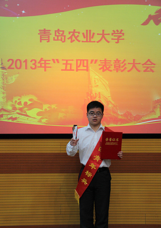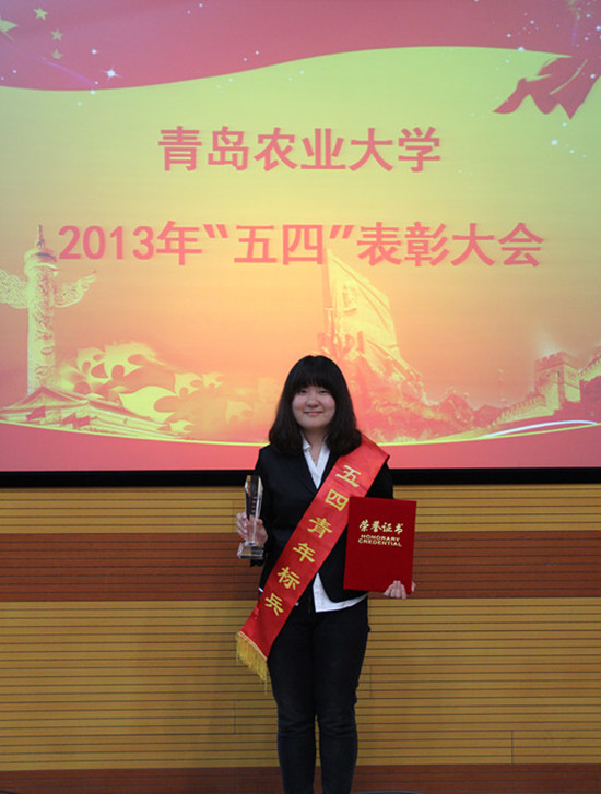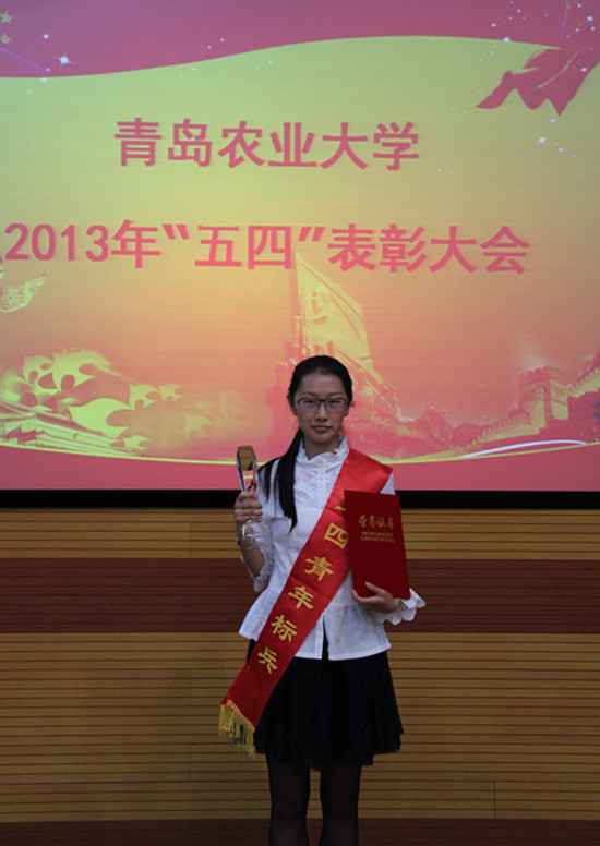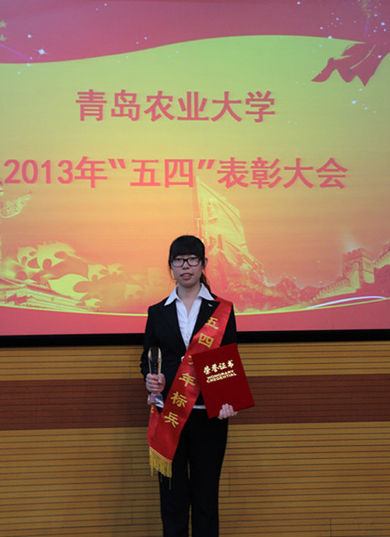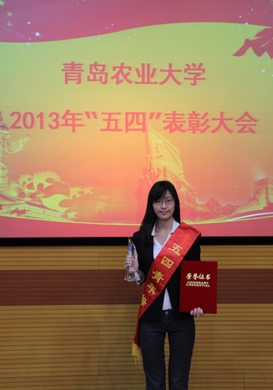 ◆积极参加各项校园文化活动并获奖:获青岛农业大学“与祖国共奋进,与学校同发展”大学生集体诵读大赛一等奖;在青岛农业大学第九届科技文化艺术节中荣获“个人优秀组织奖”、“我的班团我的家”PPT演讲大赛一等奖、“挑战杯”大学生创业计划大赛三等奖、“给力青春”微故事、微摄影大赛优胜奖、“规划引领发展,选择成就自我”职业生涯规划大赛优胜奖、“走访特教中心,宣扬人文精神”最受欢迎志愿者。获院级“戒烟禁酒,美在身边”征文比赛三等奖、“短暂的生命,永恒的精神”征文比赛二等奖、“贯彻十八大,青春永向党”征文比赛二等奖、“风云职场,我最闪亮”模拟求职大赛二等奖、“备战在今朝未来我做主”大学生创业创意大赛二等奖、“喜迎党代会青春我最虹”征文活动二等奖、寒假社会实践报告三等奖。