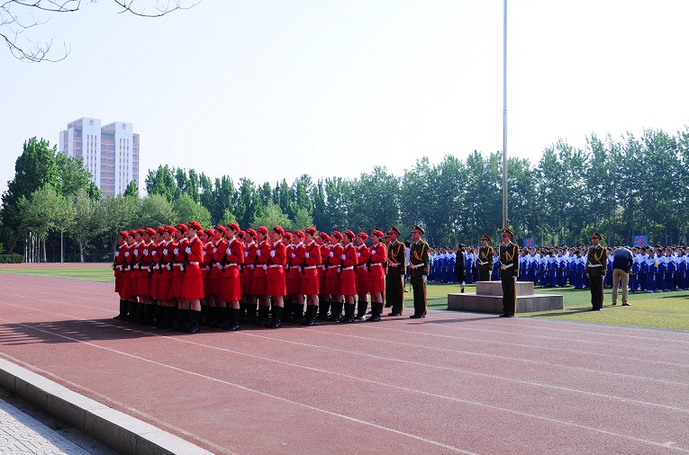上午7时30分,城阳实验中学全体师生穿着整齐肃立在国旗台下,升旗仪式正式开始。伴随着洪亮的“齐步——走”口令声,训练有素的国旗护卫队队员们保持着整齐划一的踢腿摆臂姿势、协调一致的频率节奏,迈着坚定有力的步伐向升旗台走去。女子方队口号嘹亮,每一双坚定的眼神,每一张严肃的面孔,每一个有力地敬礼,昭示着青春蓬勃下的那份庄严与肃穆。伴着雄壮激昂的国歌声,鲜红的国旗徐徐升起,国护队训练有素、雷厉风行的良好风貌无不感染着在场的每一个人,数千双眼睛坚定不移地追随国旗,希望的曙光与太阳一同升起。
