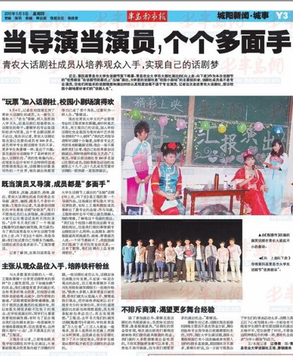 现在在青农大学文化产业管理专业的王琨老家在新疆,高中时是艺术生,用王琨自己的话说,加入学校话剧社完全是因为他对高中艺术指导老师的“个人崇拜”。“我的艺术指导老师对话剧十分偏爱,如果有专业艺术团体来新疆演话剧,他会一场不落地带我们去看,他自己也经常参加话剧演出,我特别崇拜那股文艺范。”王琨说,尽管目前话剧社有200多名登记在册的成员,但经常参加活动的也就那么十几个,这十几名成员凭着对话剧的一腔热爱一直坚持演出。