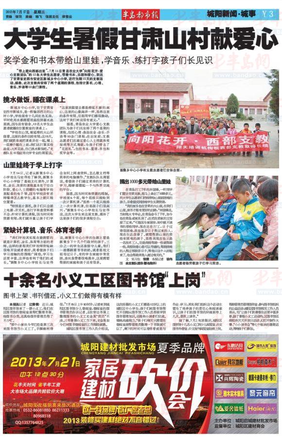 “带上爱向西部出发”,7月14日青岛农业大学“向阳花开·爱心支教团队”的12名大学生志愿者,带着书本、乐器和爱心,到达了甘肃省定西市安定区新城乡中心小学,进行为期15天的支教活动。据悉,此次支教共安排了两个星期的课程,包括计算机、心理、音乐、手语等10余门课程。