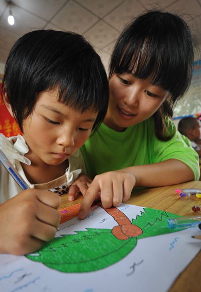 图一7月20日,青岛农业大学农学与植保学院的大学生安琪(右)在沂蒙山区枣庄市山亭区七里河村辅导留守儿童绘画。