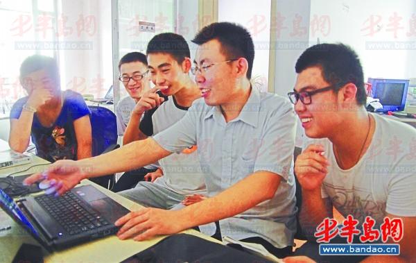王骥鹏(右二)给在公司实习的大学生讲解网站制作过程中遇到的问题。