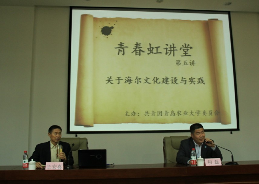 报告中王安喜书记对引领企业发展的海尔文化进行了详细的解说,首先说明了海尔企业文化概念的提出与理论形成。就海尔文化的由来与体系进行详细介绍,简述了海尔文化体系的核心价值,即海尔文化的精神文化。其精神文化主要是有由永远以用户为是,以自己为非的是非观,创业与创新的两创精神的创业观,人单双赢的利益观组成。海尔文化体系,海尔精神,海尔作风不断升级创新。之后,王安喜书记提出了海尔文化建设与实践,主要以继承,借鉴,参与,实践四个方面,结合现实实例进行了阐释。他向同学们讲述了如何利用儒家思想来推动企业文化发展,希望大家注重,并多学习、运用儒家思想。王安喜书记说明海尔文化是海尔创互联网时代全球化品牌的灵魂,体现了海尔文化对海尔集团的重要性,是海尔走向世界,回报社会的支柱。王安喜书记说:“海尔文化目前整体形势不错,但是仍然存在很多不足,我们不要被目前的情况所蒙蔽,还需要更进一步。”同时他在寄语中表达了他对同学们的期望,“只要你是金子总会发光,天道酬勤。”号召同学们要坚持不懈地实现自己的人生目标。