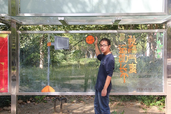 来自机电工程学院的大二学生张腾在此合照并表示,很喜欢这个运动主题的手绘,我是个“篮球迷”,看到篮球就兴奋,学习之余,会约上伙伴一起去打篮球,我很享受运动中大汗淋漓的感觉,在我看来,篮球代表着运动,运动代表着快乐。