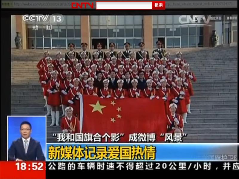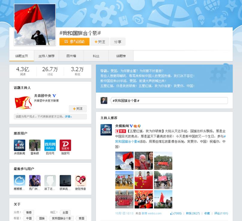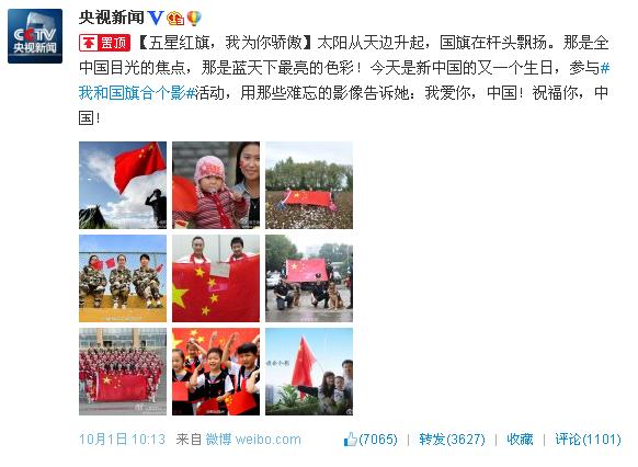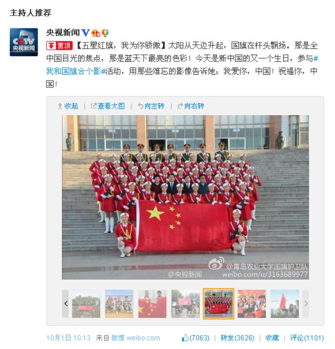 央视晒出的与国旗合影照片中,有独自守卫祖国边疆的英勇战士,有在仁川亚运会为国争光的运动员,更多的还是生活中平凡朴实的老百姓,上至耄耋老者,下至咿呀婴童,无论身处神州大地,无论远在异国他乡,大家用同一种方式——与国旗合影,表达着共同的爱国情感和美好祝福。其中,来自青岛农业大学国旗护卫队的国旗合影格外抢眼。姑娘小伙们身着整齐鲜艳的制服,簇拥着学校领导,挺立于学校的标志性建筑主楼台阶前,在飘扬的五星红旗下,喊出了青春的誓言,祝福祖国,祝福学校。在国庆节这个特殊的日子,国护队的队员们与朝夕相处的国旗留下了宝贵的合影,其中蕴含的情感别有不同。每日伴着晨曦,升起五星红旗;每日伴着夕阳,将国旗守卫。风雨无阻,青春誓言,队员们在对一姿一式的苛求中践行着对祖国的承诺,用执着的坚持诠释着对祖国的热爱。海内外近4.3亿人阅读,26.7万人讨论,7000名网友为照片点赞,5000余条的评论转发中频现溢美之词。有网友评论说,第七张是青农国护队,感觉好骄傲!加油中国!加油青农!