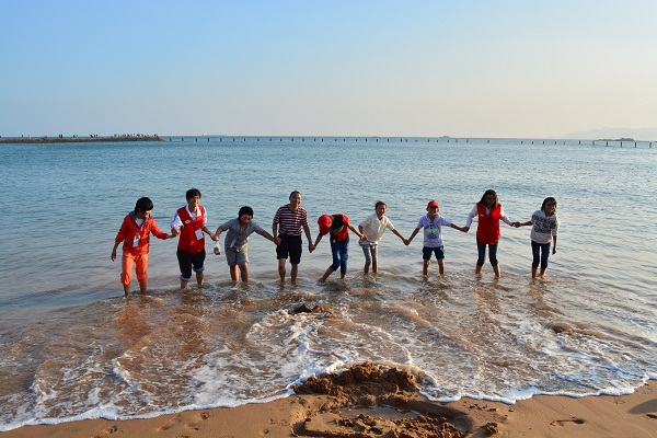 “好想看看大海是什么样子的。”两年前支教队第一次来到鲁能滕州希望小学便被孩子们这个单纯的梦想打动。行程的最后一日,在结束了梦幻般的极地海洋世界之旅,孩子们奔向了此次行程的最终目的地——美丽的大海。穿过八大关郁郁葱葱的马路,蜿蜒曲折的海岸线散发出熠熠光彩。从未见过大海的孩子们,脚下的步伐渐渐加快。在柔软细密的沙滩上,孩子们乐得手舞足蹈,牵着志愿者哥哥姐姐的手奔向大海的怀抱,“姐姐,可以给我一个瓶子吗?”极少言语的韩欣雨试探着问身旁的志愿者,小欣雨想装一瓶沙子带回家给妈妈。徐祥浩俯下身子尝了一口海水,“好咸!原来这就是大海的味道。”志愿者陪同孩子们一起捡贝壳、做沙画、冲海水、谈梦想,和孩子们结下了深厚的情谊。