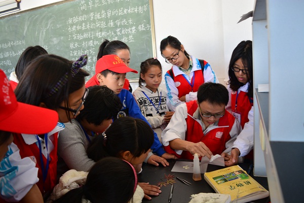 孩子们抵达的翌日,照顾到大家的体力精力状况,支教队的志愿者们安排了校园游览项目。带领孩子们徜徉于青岛农业大学的美丽秋景之中,五环体育场、昆虫博物馆、知音广场、教学区,让孩子们充分感受到大学优美的自然环境和宁静祥和的学术氛围。活动特别安排孩子们前往实验室,学习制作昆虫标本,在简单介绍了实验室环境后,启发孩子们创作的灵感,在志愿者的帮助下制作出精美的标本作品。支教队队员们还带着孩子们来到学校主楼,在校园广播直播间里俯瞰校园全景,并录制了一期音频节目,大家留下共同的珍贵回忆。