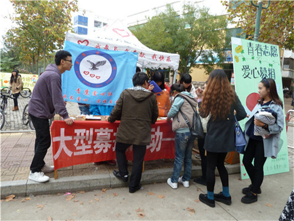 11月1日,我校青鹰爱心社的志愿者们在东苑三号楼前举办了以“青春志愿,爱心募捐”为主题的大型募捐活动,所有募集到的物资将由“青岛在行动公益服务中心”发往曹县等地区的贫困家庭。
