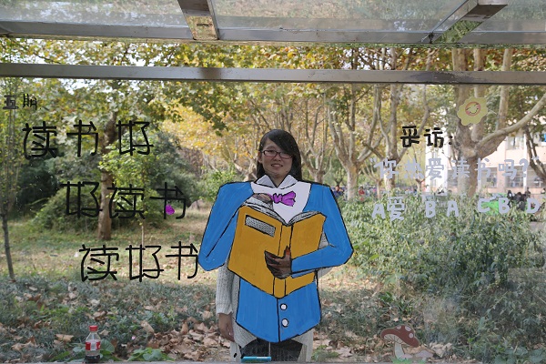 幽静蜿蜒的毓秀路旁,色彩缤纷的卡通字体采访格外引人注意,“你热爱读书吗”,幽默的选项设计,让过往的同学会心一笑,真切的感受到读书是大学生活的必选项。同学们站于玻璃栏之后,即可完成与手绘图案的“亲密组合”,摇身一变读书达人,身着蓝色西装,左手托书,右手翻动书页,畅游知识海洋。或蹙眉沉思、或展颜释怀,配合着同学们的生动表情,展现了人与书对话中的思考,拉近了人与书之间的距离。怡神旷心、增趣添雅、长才益智,这一期的玻璃手绘用绘画和文字结合的语言,表达了同学们对涉猎群书的渴望,以及沉浸在书海中的怡然心情。