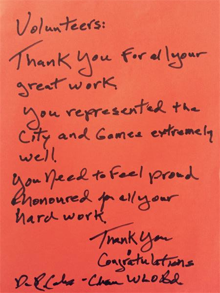 日前,世界休闲组织理事会主席罗杰·科尔斯向我校世休会志愿者发来感谢信,对我校世休会外联团队志愿者的“一对一”接待外宾志愿服务工作给予高度评价,感谢青岛农大世休会外联团志愿者的辛勤付出,感谢青岛农大对2015世界休闲体育大会的大力支持。