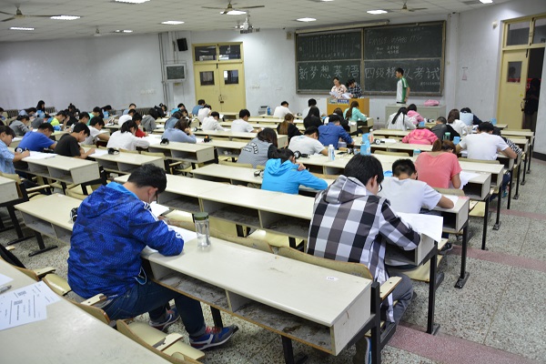同学们提前进入教室,检查听力耳机,调整心态。考试铃声一响,教室一片肃静,同学们认真阅读试题,全神贯注,谨慎作答。考场监考人员按照四六级考试的标准时间给予到时提醒。