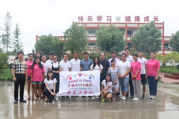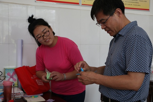 杨校长还来到枣庄市滕州市滨湖镇鲁能滕州希望小学,探望在这开展“悦来越有趣·乡村儿童主题式阅读成长体验营”活动的手拉手义务支教队队员。杨校长一行在队长孟遥遥的带领下,参观了“悦·读书坊”、“悦来越爱演”为主题的教室,了解了本次手拉手社会实践“悦来越有趣·乡村儿童主题式成长体验营”活动的开展情况。参观结束后,杨校长一行又到支教队员们备课的办公室,与志愿者们亲切交谈。他详细的询问了每一位队员的授课计划,并与队员们在备课、支教的感受等方面充分交流。杨校长饶有兴致地拿起正在准备折纸教程的队员桌上的蓝色千纸鹤,与队员分享了自己的童年回忆。看到充满活力的支教队员们,杨校长深有感触的说到:“我觉得同学们都来自不同专业,并且开展这么多有兴趣的课程特别有意义。这里的生活条件虽然艰苦一点,但是我想同学们都能够克服,以支教实践为乐趣,从中获得成长。”