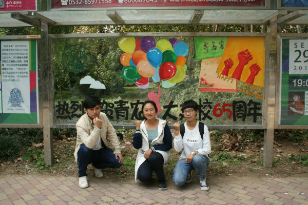 为庆祝青岛农业大学建校65周年,由青岛农业大学学生会设计绘制的“庆祝建校65周年”的主题玻璃彩绘在毓秀路亮相。饱含莘莘学子深情的饱满色彩中,表达了学校全体青年学生对学校六十五岁生日的祝福。