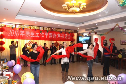 刘国秋在致辞中表示,握手辞行的2009年,在全体学工人的共同努力下,我校学生工作各项事业焕发出了无限激情和勃勃生机。大学生思想政治教育工作、学生资助工作、心理健康教育工作、宿舍管理工作等多次受到上级表彰奖励,为学校赢得了荣誉。她希望全体学工人在新的一年抢抓机遇,奋力拼搏,以更加优异的成绩,共创学生工作更加辉煌的明天!