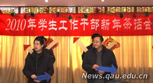 校党委书记周学宝在致辞中指出,2009年,是我们伟大祖国永远铭记的不平凡的一年;是学校内涵建设显著增强,重点工作、常规工作、保障工作取得重要进展的一年,也是我校学生工作取得非凡成绩的一年。近年来,我校高度重视辅导员队伍建设,辅导员队伍的学缘结构日趋合理,队伍日趋壮大,建设了一支政治素质强、工作作风扎实,关键时刻能冲的上的过硬队伍。周学宝高度肯定了学生工作系统在学校甲流防控工作中的关键作用。在防控工作中,学生工作系统全体同志自觉奉献、恪尽职守、攻坚克难,牢牢把住甲流防控第一道防线,为学校甲流防控工作取得阶段性胜利做出了不可磨灭的贡献。他希望全体学生工作干部在新的一年以更加振奋的精神,更加务实的作风取得更大的成绩,不断开创我校学生工作的新局面。