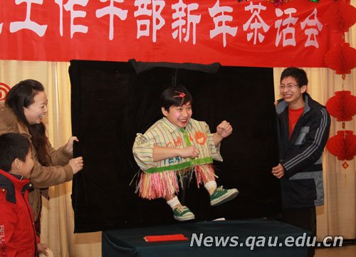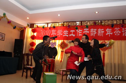 12月26日上午,国际学术交流中心一楼大厅里笑声连连,掌声不断,学生工作部举行2010年学生工作干部新年茶话会。校领导周学宝、刘军国、刘国秋、王伟,城阳移动公司经理吕宪贵、城阳铁通赵克珍局长、学校相关职能部门负责人、各学院党总支书记应邀与全体学生工作干部一起共庆佳节,共话未来。