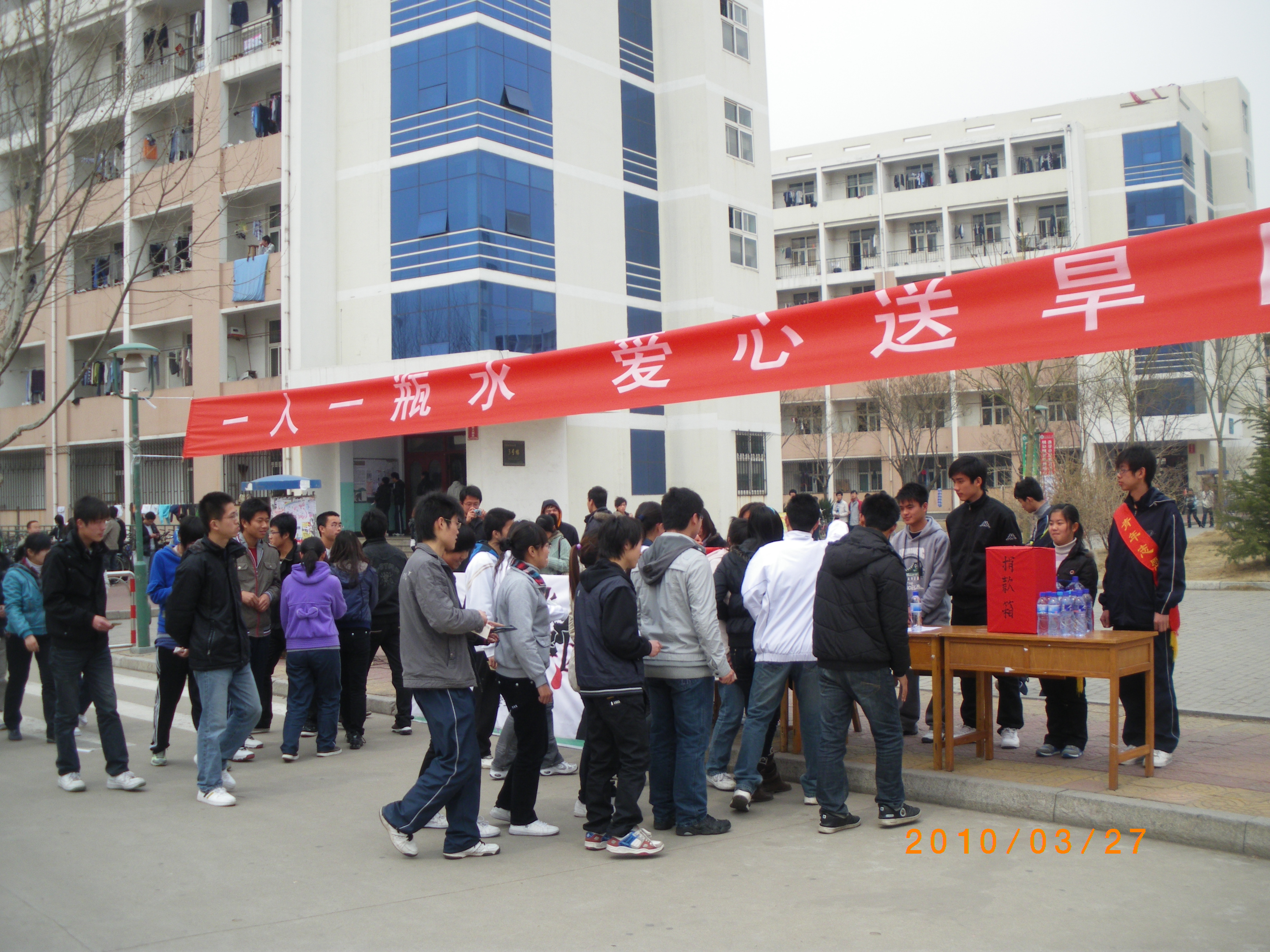 募捐活动在学校东苑3号楼前、邮政所门口和西苑餐厅门口同时展开。活动一开始,就受到广大同学的极大关注,同学们纷纷自发地前来捐出自己的爱心。“捐出一瓶水的钱,虽然不多,但表达的是我们农大学子的一份爱心。”青岛农业大学学生会主席王兆如是说。
