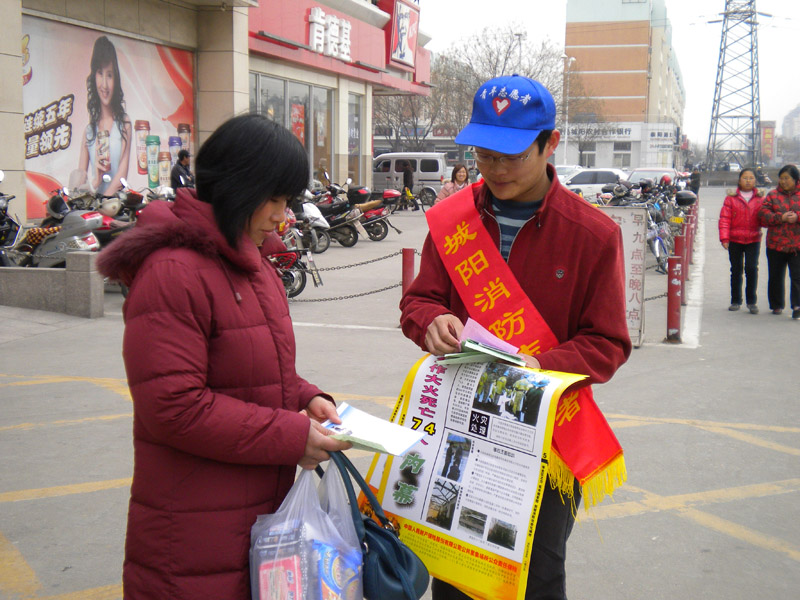 本次活动分为散发关于安全用火防火知识传单和参观城阳区消防支队营区两部分。上午八时许,我校青年志愿者同消防支队官兵一起来到国货,开展了散发关于宣传安全用火防火常识传单的活动,志愿者一边热情的向行人打招呼,向他们发放传单,一边富有耐心的向行人讲解安全用火防火的重要性。路人看到我们真诚的服务和笑容,也对我们的工作给予了充分地肯定,为我们竖起了大拇指。国货人流密集,车来车往,我们准备的传单不一会便全部发放完毕,现场氛围热烈而融洽。