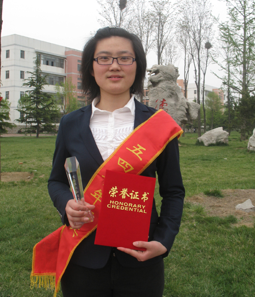 沈珊珊,经济与管理学院会计07.4班,中共党员,2008—2009学年获国家奖学金,被评为“优秀学生干部”;连续两年获专业一等奖学金,被评为“三好学生”、“优秀团员”;获全国“新公民杯”大学生公益项目征集大赛纪念奖;带领数学建模协会获“山东省优秀大学生科技社团”;获“用友杯”全国大学生创业设计大赛二等奖;获市“我与图书共成长”征文二等奖;获校“为奥运助威”系列活动“优秀组织个人”;带领文学社获“十大优秀社团”;获校原创校文学征集比赛一等奖;在辩论赛中被评为十大优秀辩手;获校“永远跟党走”的演讲比赛二等奖;获校“奏响五四精神乐章”音乐诗会二等奖;获“书墨飘香”校书法比赛二等奖;获中华美文配乐朗诵大赛三等奖;校刊上公开发表两篇文章。