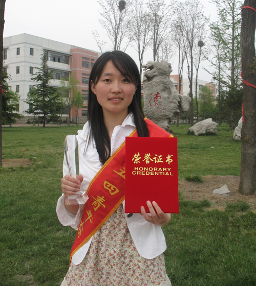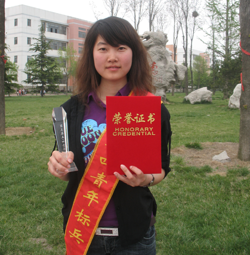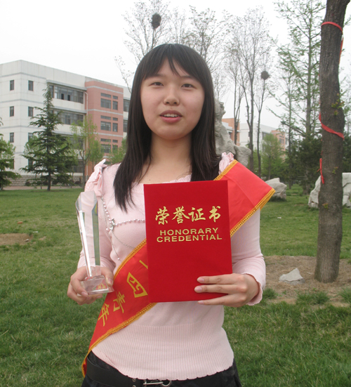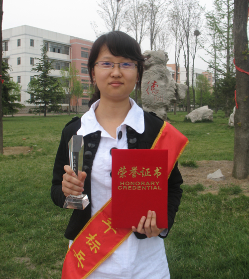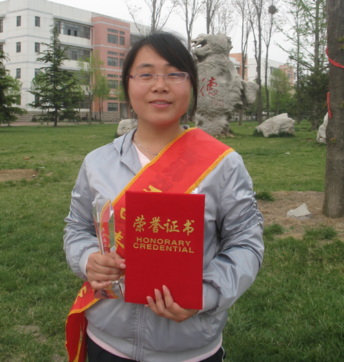 毕秀丽,外国语学院英语07.4,中共党员,2007-2008学年被评为校“三好学生”并以专业第一名的成绩获一等专业奖学金;2008-2009学年被评为校“三好学生”并以专业第二名的成绩获一等专业奖学金;2007-2008学年荣获国家励志奖学金;2008—2009学年荣获国家奖学金;2008年参加全国大学生英语竞赛获全国二等奖;2009年参加剑桥商务英语(高级)考试,获得英国剑桥大学考试委员会颁发的合格证书;获得计算机二级(VB)合格证书;2008—2009学年荣获“综合素质优秀学生”称号,并被评为“校报十大优秀学生记者”;2009年荣获“青岛农业大学社会实践调查报告三等奖”;2007年荣获“第七届科技文化艺术节优秀个人组织奖”。