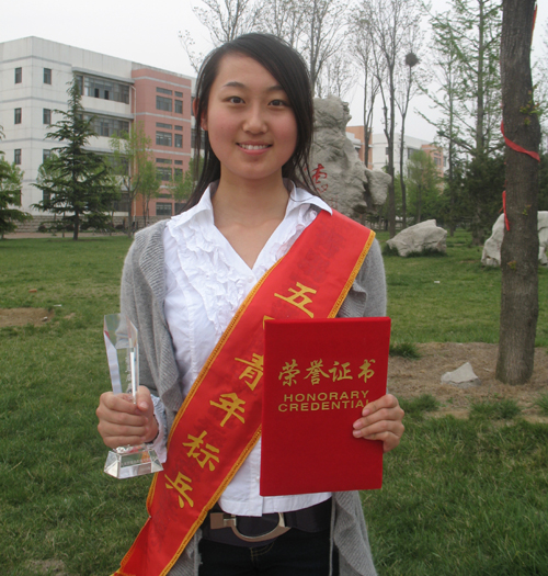 王海霞,动物科技学院动科07.6班,中共党员,07-08学年,获一等专业奖学金,“亚太中慧”企业奖学金,校“三好学生”、校“优秀学生干部”、校“优秀团员”等荣誉称号;第七届大学生科技文化艺术节中,获“爱拍青春 大学生手机电影”一等奖、“扬帆奥运 传承文明”礼仪风采大赛的二等奖。;青岛市“心随帆动 加油2008”奥运啦啦队大赛优胜奖;2008年残奥会帆船比赛志愿服务工作中,表现优异,被评为优秀志愿者;获得了第29届奥帆赛组委会开闭幕式工作部的演出纪念证书。08-09学年,获特等专业奖学金、校“优秀学生干部”、校“优秀团干部”、“校十大优秀学生”等荣誉称号;第三届“布莱凯特”杯科技英才奖; 2009年获大众日报社社会调查三等奖;09-10学年,寒假社会实践先进个人。