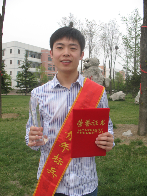 顾祥昆,园林园艺学院设施06.2班,中共党员,06-07学年,以专业第一获一等专业奖学金,被评为“三好学生”、“优秀团员”、“优秀学生干部”;获第二届“翔天杯”舍歌大赛三等奖;07-08学年,以专业第一获国家奖学金、一等专业奖学金,被评为“省级优秀学生”、校“综合素质优秀学生”、“三好学生”;获百科知识竞赛优胜奖和“个人优秀组织奖”;获“绿色奥运,绿色城市”环保购物袋设计大赛优胜奖;获“茶叶芬芳,奥运增香”茶文化图片展优胜奖;撰写的调查报告获校“暑期社会实践活动优秀调查报告优秀奖”;08-09学年,以专业第一获国家奖学金、特等专业奖学金,被评为“省级优秀毕业生”、校“十大优秀学生”、“三好学生”;获单科学习优胜奖;2010年,以专业第一的成绩考取了中国农业科学院的研究生。