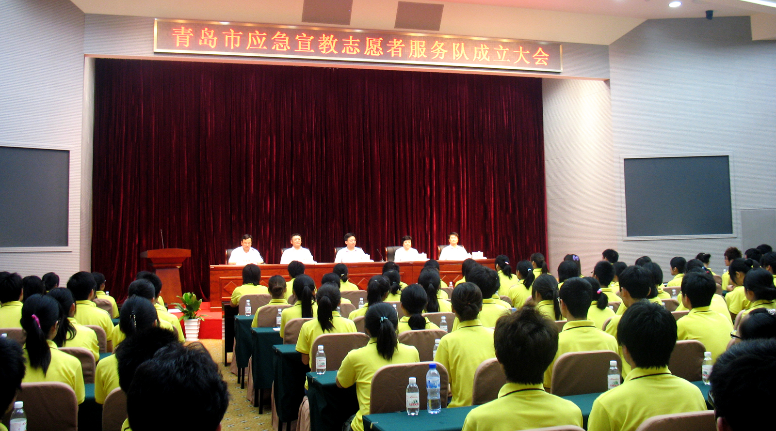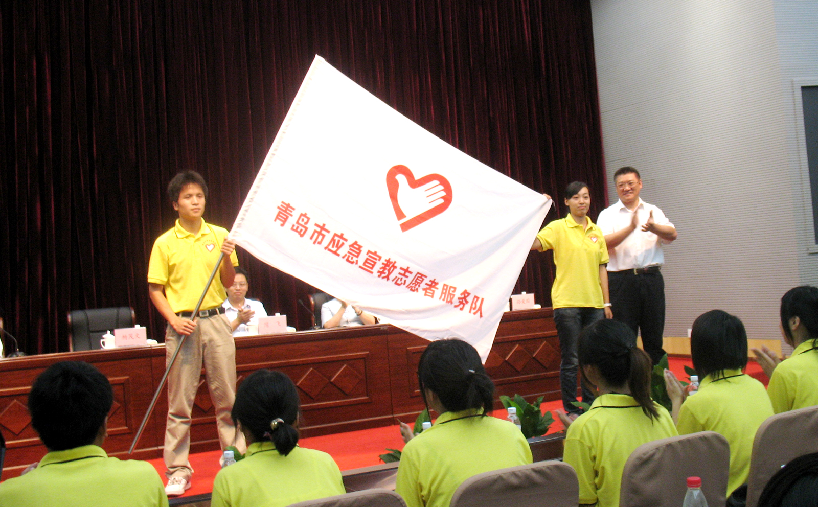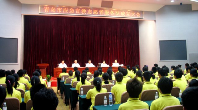 7月16日,青岛市应急宣教志愿者服务队成立大会在青岛市政府行政审批大楼会议室举行,共青团团青岛市委书记陈飞、青岛农大纪委书记刘国秋、市应急办主任杨茂文、市地震局副局长孙爱国以及来自青岛农业大学的首批300名应急宣教志愿者参加了大会。