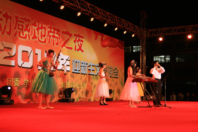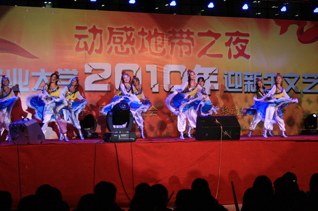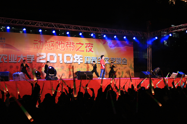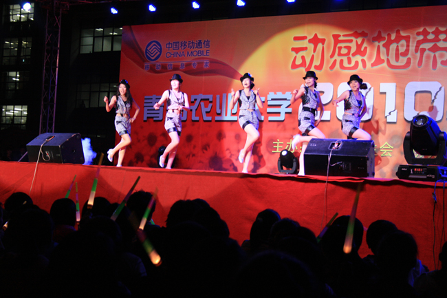 10月10日晚,由校团委、学生会主办的青岛农业大学“动感地带杯”2010年迎新生文艺晚会在虹子广场举行。校党委副书记张铭锦、副校长戴洪义、副校长宋希云、校纪委书记刘国秋、城阳移动公司金志刚副总经理、中国铁通城阳分局赵克珍局长以及各部门、学院领导老师和近万名2010级新生同学共享了这一场歌舞盛宴。