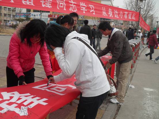 上午9点,东苑三号楼前,“向雷锋同志学习,从身边的小事做起”学习雷锋签字活动在这里举行。偌大的条幅铺展开来,在劲风的吹动下飘扬,吸引了众多同学热情参与,到15:00活动结束时,千余名同学的名字已遍布条幅的每一块地方,彰显着青春和奉献的热情。采访中一名同学说:“我们也是和当年雷锋当兵年龄相仿的热血青年,雷锋精神是我们每个中国人都应该有的精神,向雷锋通知学习,有你,也有我!”(曹现灯)