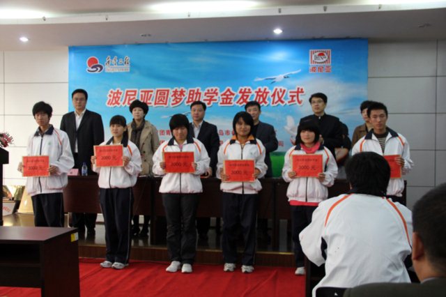 11月16日上午,由共青团青岛市委员会、青岛市希望工程办公室主办,共青团城阳区委员会、青岛波尼亚食品有限公司承办的青岛市2010希望工程圆梦行动—— “波尼亚圆梦助学金”发放仪式在青岛波尼亚食品工业园会议厅举行,青岛团市委副书记夏正启、青岛农大团委书记慕乾伟、城阳团区委书记刘青梅、青岛波尼亚食品有限公司董事长赵向进、城阳团区委副书记王芸竹、青岛农大团委副书记王峰等出席发放仪式,并为青岛农业大学10名品学兼优、家境贫困的学生颁发了“波尼亚圆梦助学金”。
