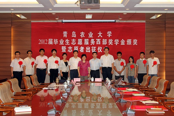 6月29日,青岛农业大学2012届毕业生志愿服务西部奖学金颁奖暨志愿者出征仪式在三楼会议室举行,校党委副书记刘国秋、副校长王伟出席仪式并为志愿者颁发奖学金、赠送纪念品。