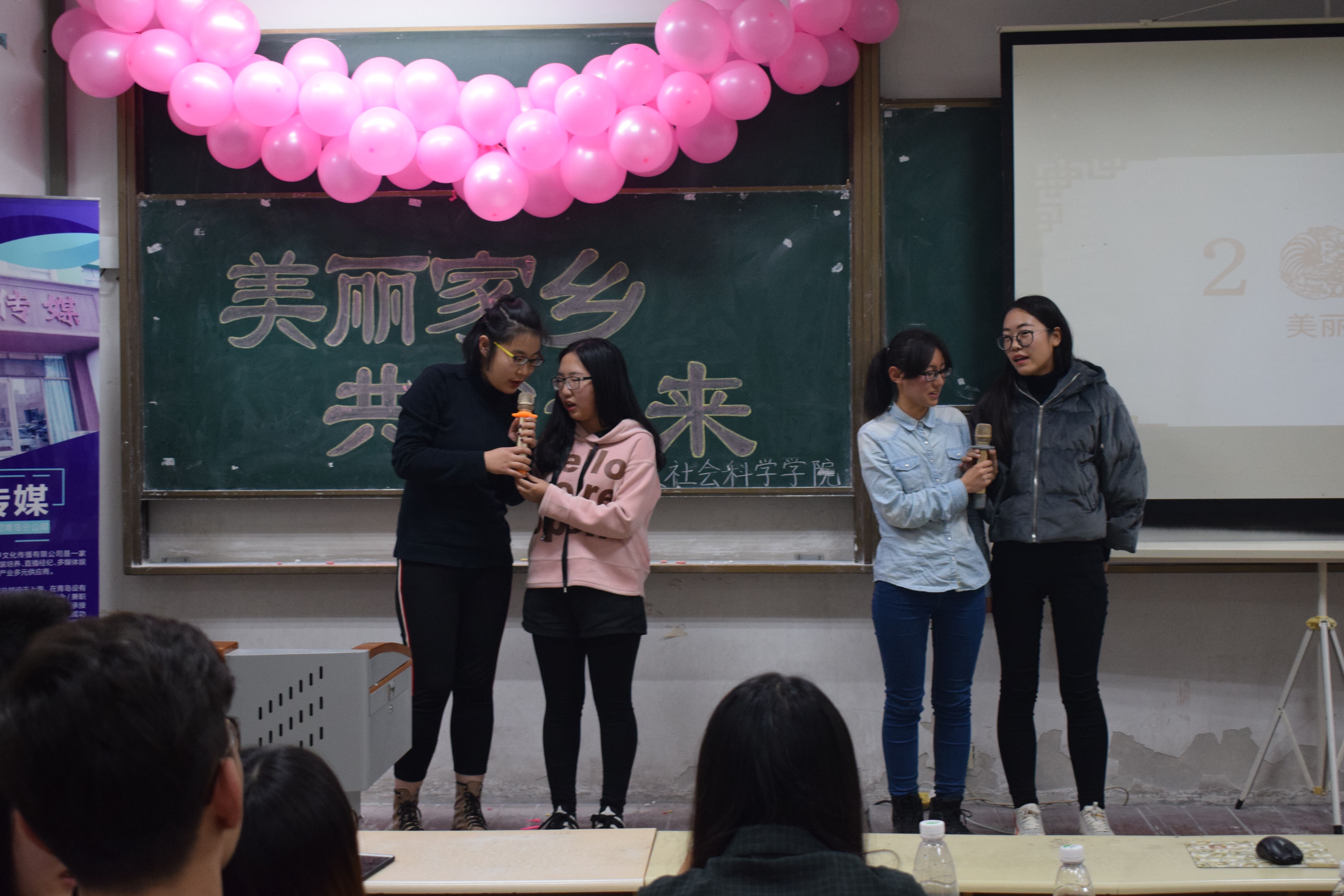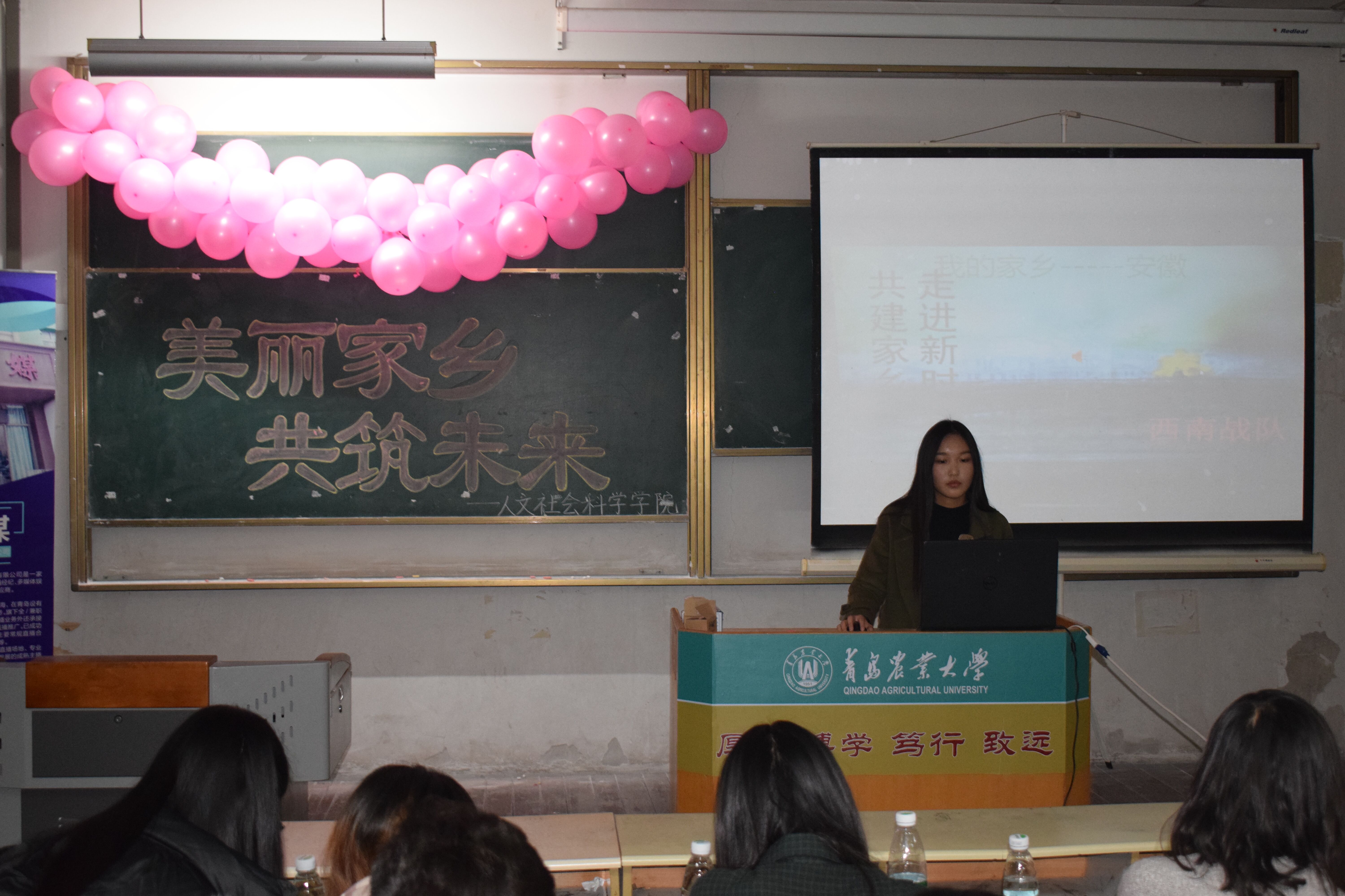 11月25日,青岛农业大学人文社会科学学院举办“关注十九大,我爱家乡美”主题比赛。此活动分为家乡展示、知识竞答和团队表演三部分,中间穿插抽奖和游戏环节。本次比赛由来自各个专业的二十名同学,根据家乡所在地分为西北、东南、西南、东北四个战队,展示家乡风采,表达对家乡的眷恋。