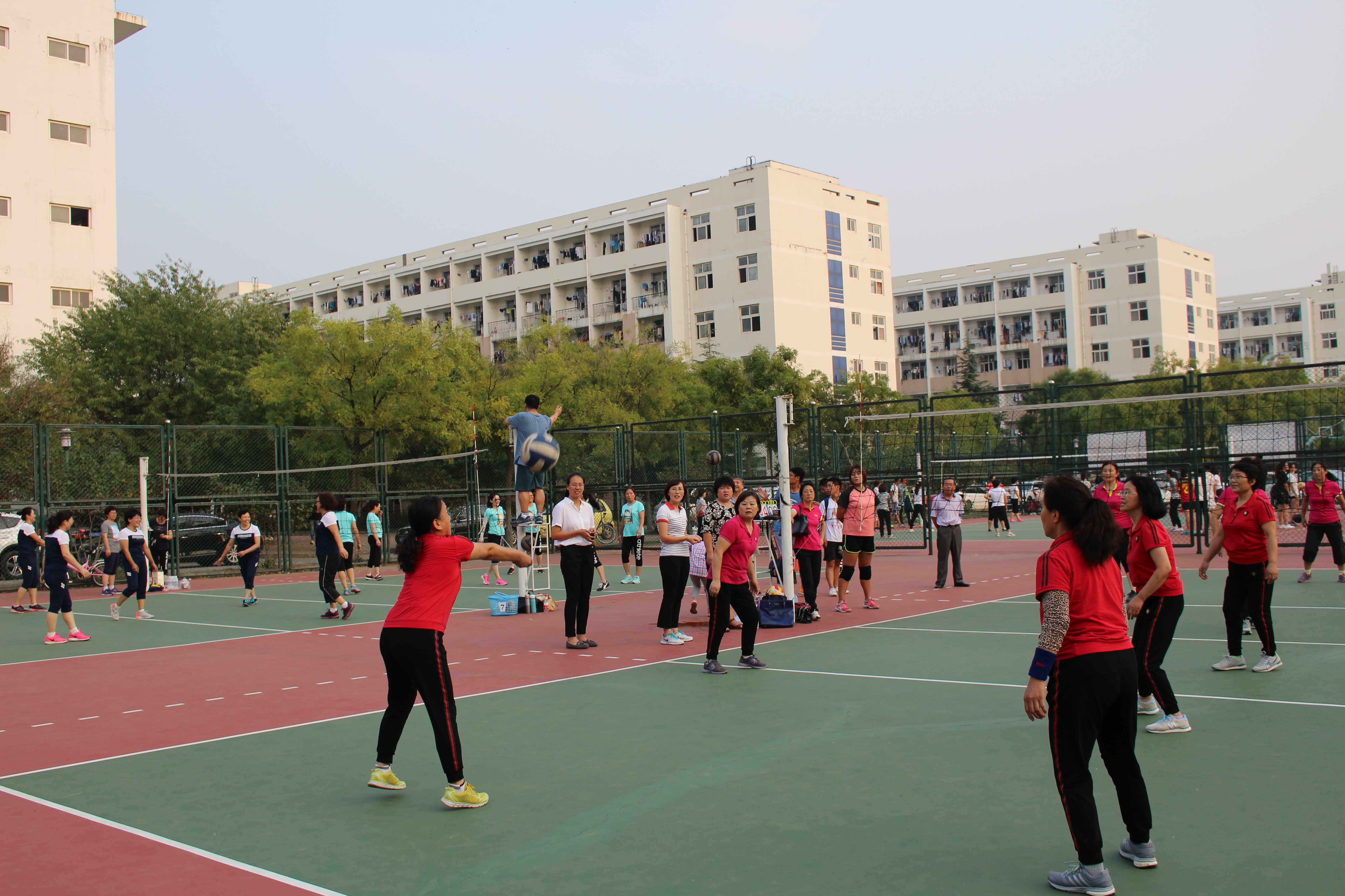 9月18日,我院男教职工篮球赛和女教职工排球赛在体育场同时进行。院党委书记袁忠林和部分教师到场加油助威。
