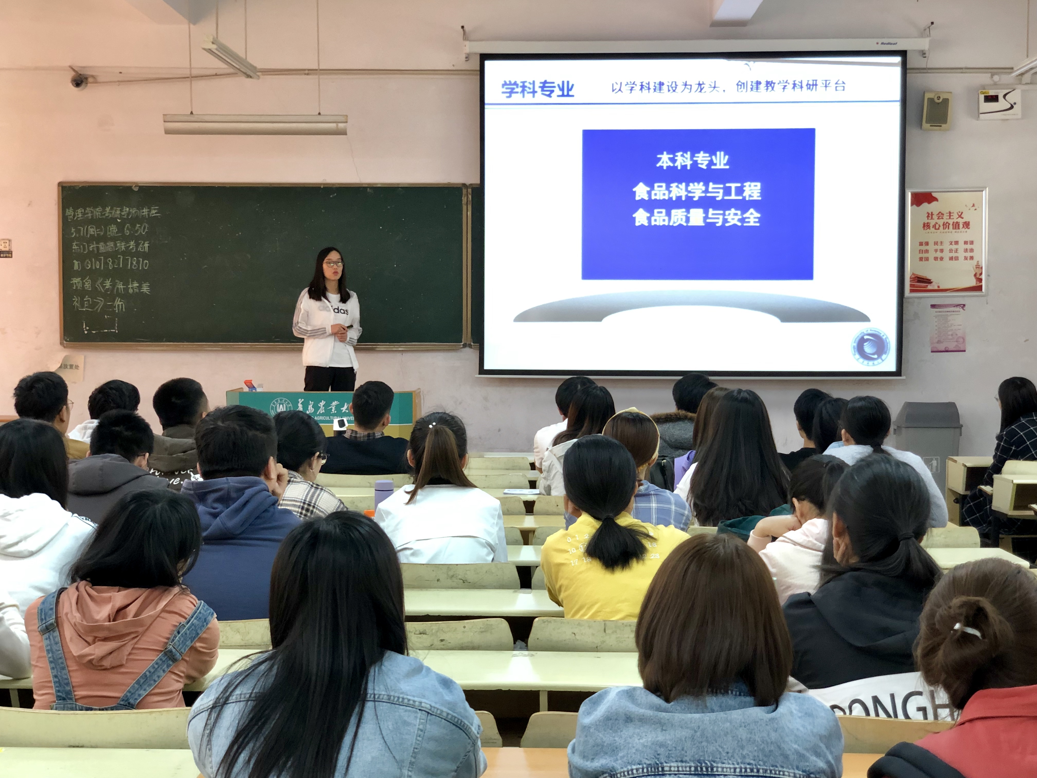 会上,杜婷首先对我院本科教育工作表示高度赞赏,近几年,我院学生在研究生入学考试中,被天津科技大学录取的人数较多,学生入学后的专业基础扎实、科研水平突出,赢得了天津科技大学广大教师的良好口碑。随后,杜婷从学院概况、学科专业、师资队伍、教学科研方面简单介绍了天津科技大学食品工程与生物技术学院。天津科技大学食品工程与生物技术学院现设有食品科学与工程一级学科博士后科研流动站等多个流动站,食品科学与工程一级学科硕士点等多个硕士点,拥有一个食品营养与安全国家重点实验室。杜婷还与现场学生亲切交流,询问他们的考研目标学校,给出相应的指导意见。她鼓励学生们与其他高校优秀学生进行交流,提前了解专业方向,为考研之路做充足的准备。