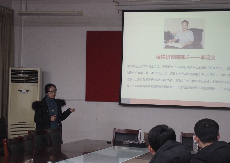 动物医学院与山东信得科技股份有限公司联合举办了校企合作同盟班,12月12日,信得同盟班于生物楼C205举行了兽医兽药行业知识培训,信得人力资源部经理、第四期同盟班班主任李晓主讲,第四期同盟班全体同学参加。