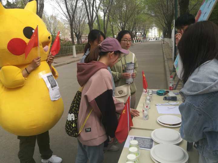 在活动前期,食品分社联进行了活动宣传展板制作、闯关游戏选定、道具准备等一系列活动准备,并于活动当天早上六点早早地来到了现场,进行场地布置。现场提供最具食品学院特色的糕点供人们品尝,更有“皮卡丘”服务人员,充分展现出了食品人的热情。活动开始,参赛选手们根据设定路线进行校园慢跑,并在指定位置进行游戏闯关打卡。在食品分社联所设闯关游戏“改革春风吹满地”中,参赛选手需要将放置有糖果和题纸的玻璃杯上的乒乓球吹出,之后进行问题作答。看似简单的游戏做起来却并不容易,游戏的灵感来源于十一届三中全会的改革春风,考验的是选手的耐心与技巧。“勇当改革带头人”的灵感则是源于改革开放初期先富带动后富达到共富的理想。参赛选手们通过品尝六杯口味不同的饮品,体味改革过程的酸甜苦辣,之后便可体会改革成果,与人形板以及皮卡丘合影留念。