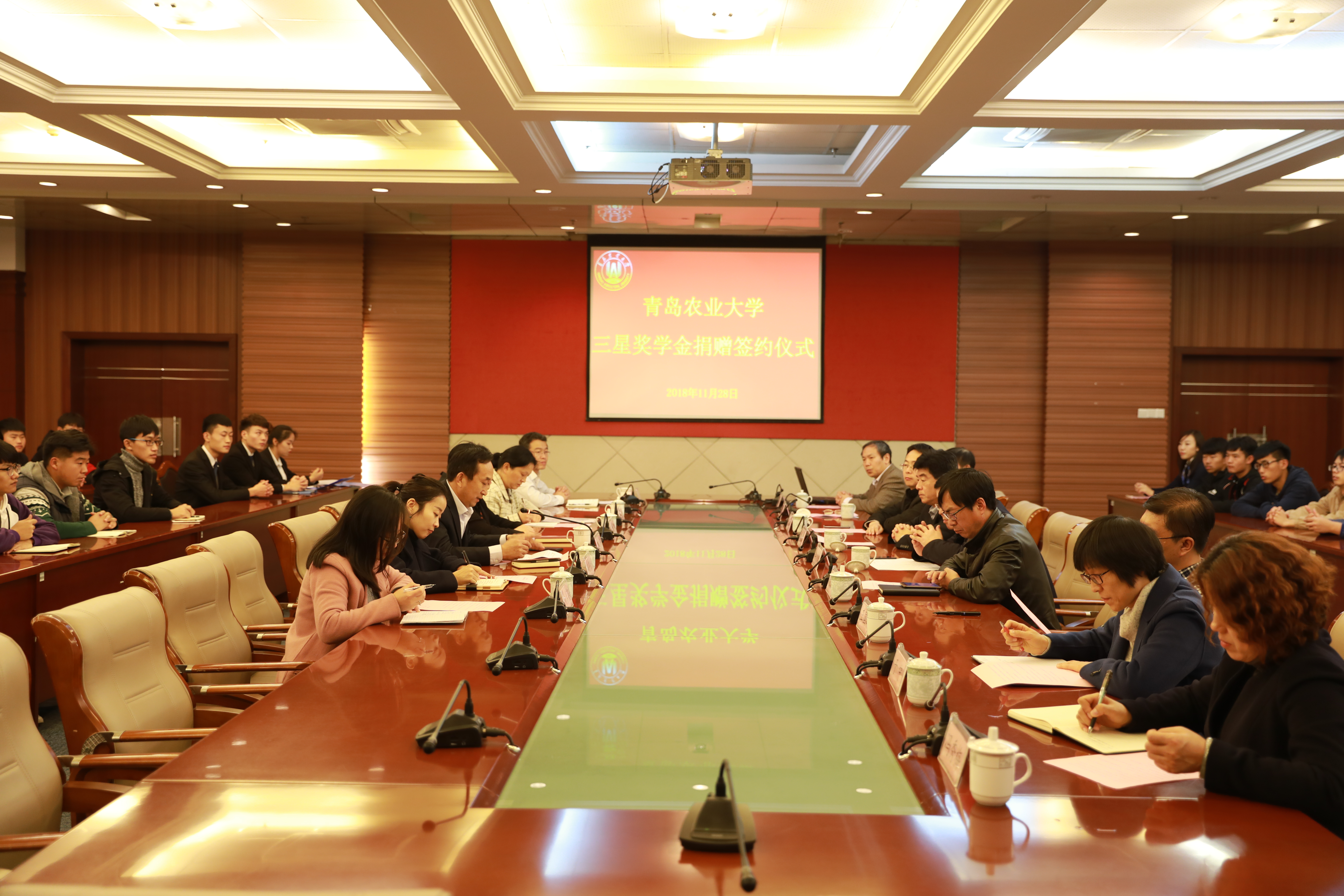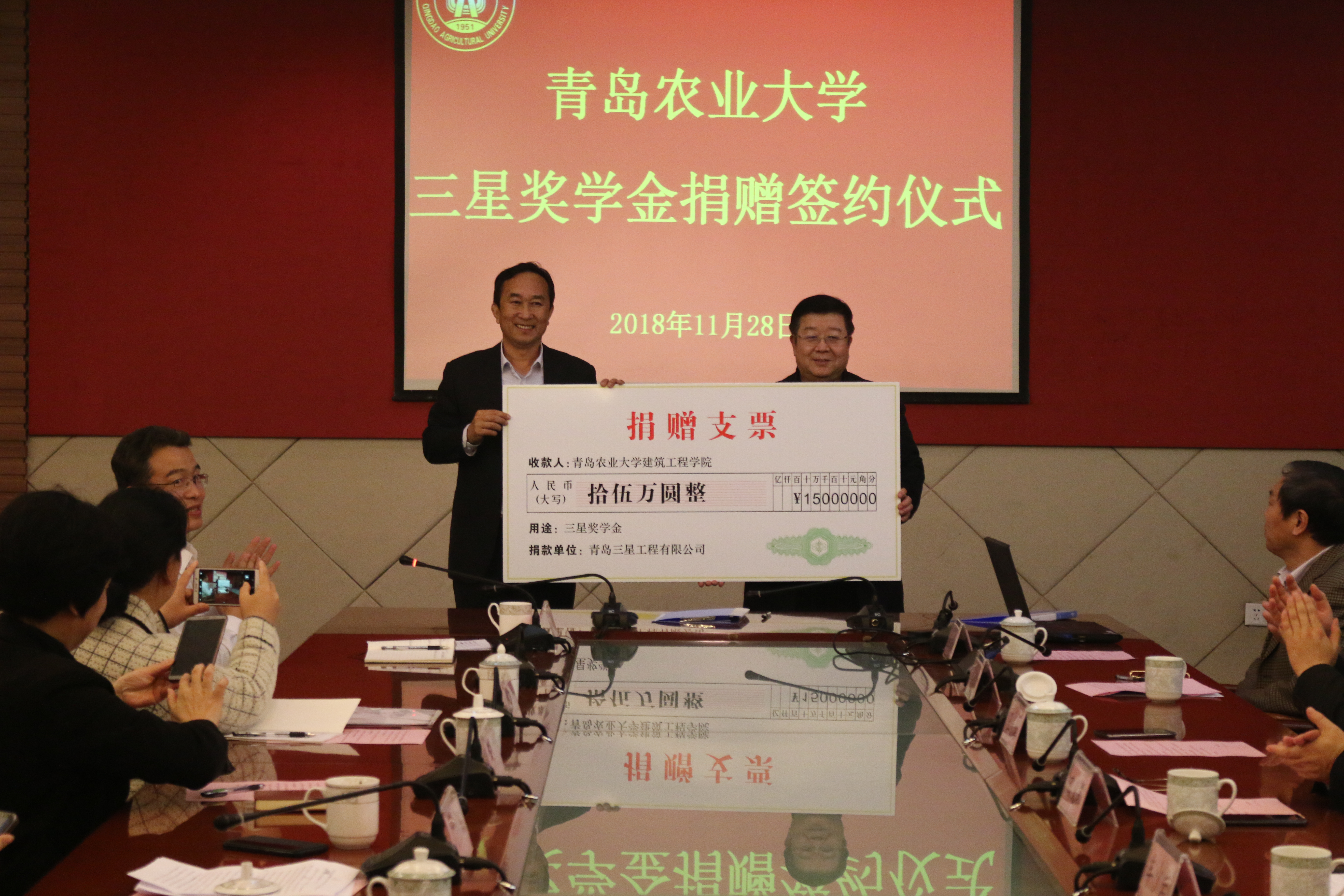 11月28日,青岛农业大学建筑工程学院于图书馆三楼会议室举行“三星奖学金”捐赠签约仪式。青岛三星工程有限公司总经理王正华、常务副总经理王维民一行来访签约,青岛农业大学党委委员、副校长牟少岩,党政办公室主任赵奎皓,教务处处长田义轲,学生工作副部长王国辉,团委副书记王光炬,教育发展基金会主任科员于宁,建筑工程学院院长李秋义,副院长冯秀梅、全洪珠出席仪式。活动由建筑工程学院党委副书记、副院长车广杰主持,学院部分学生代表参加会议。