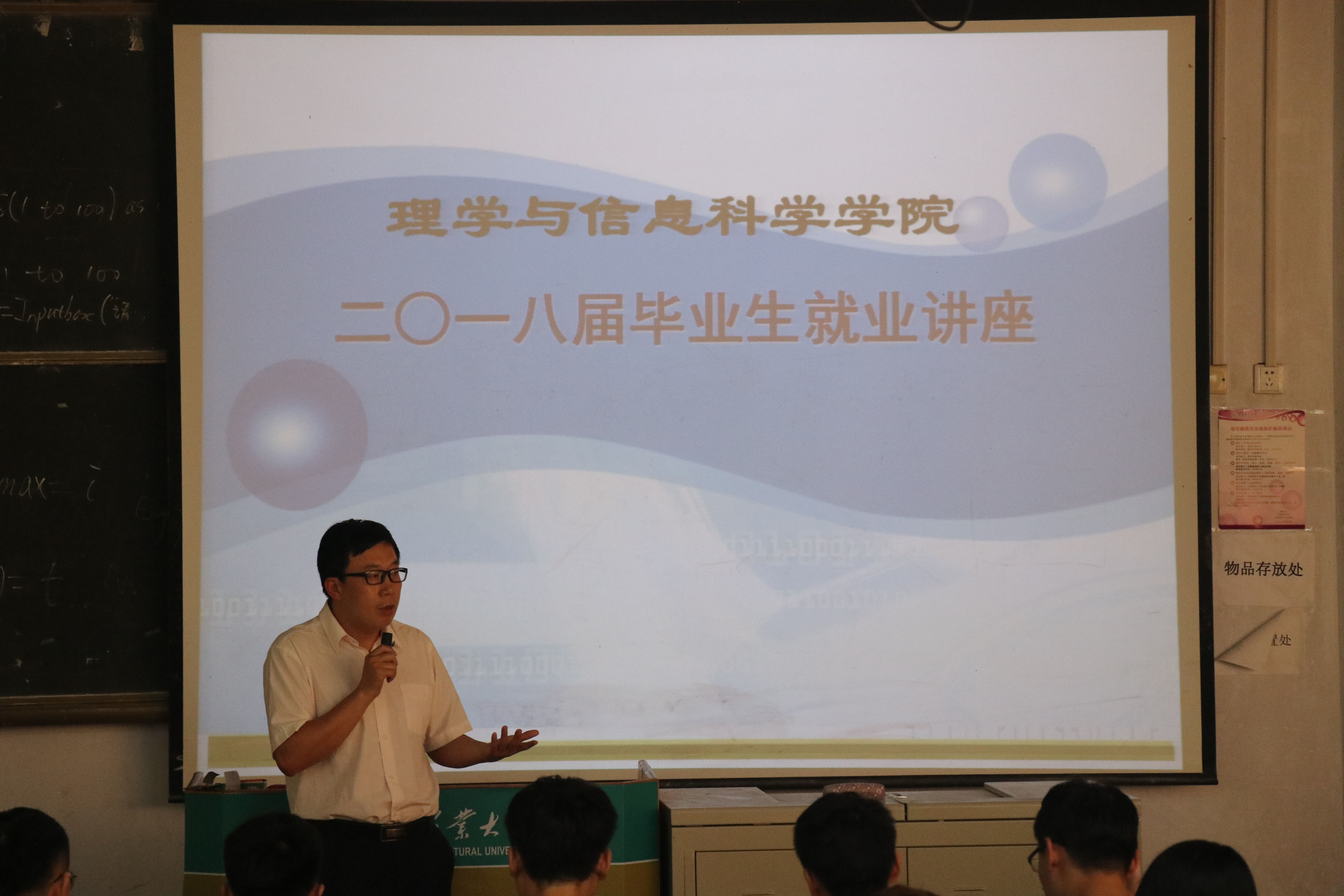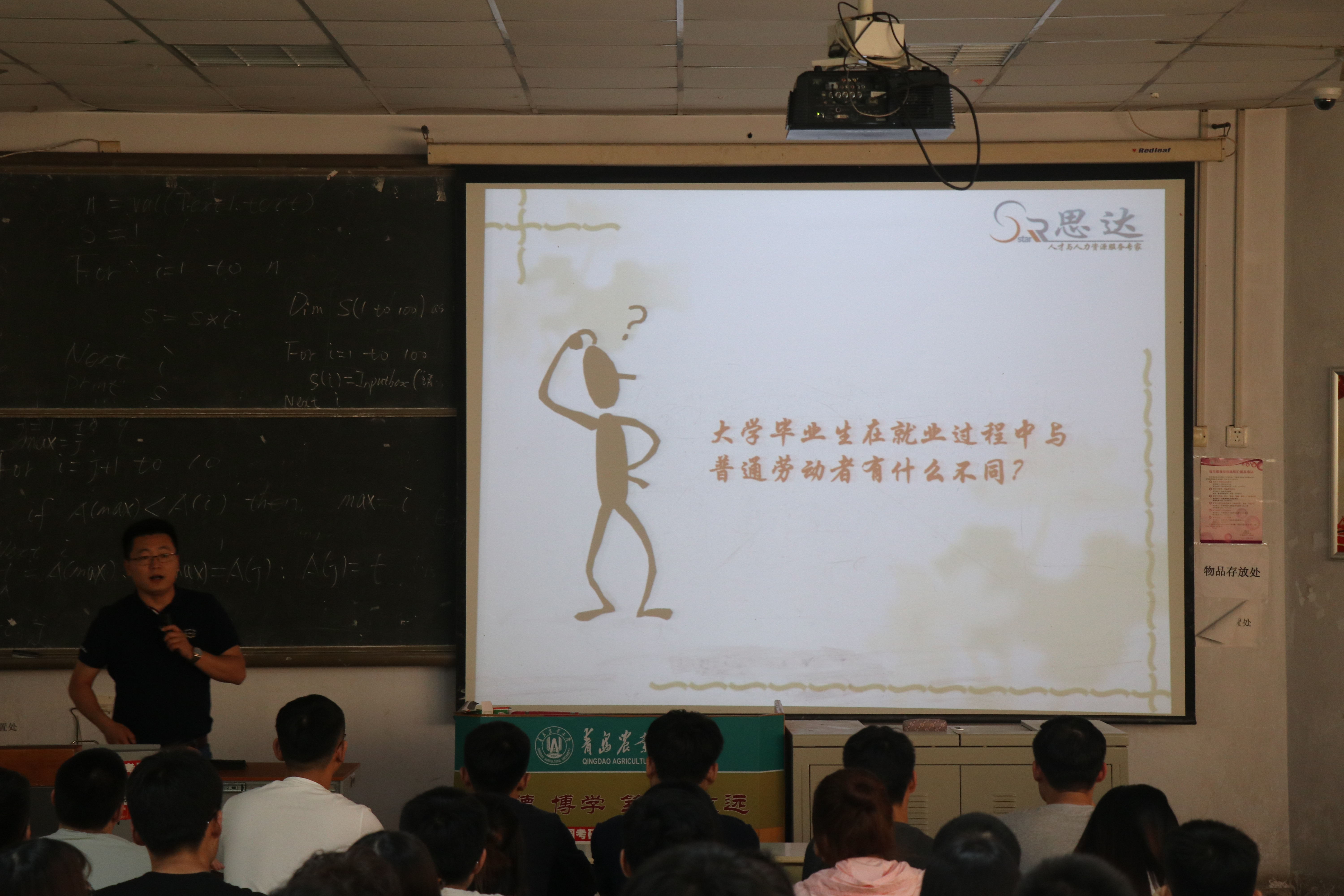 5月23日,青岛农业大学理学与信息科学学院在教学区召开了就业指导会议,会议邀请青岛思达管理顾问有限公司副总经理葛斌为同学们进行了就业讲座。本次会议由学院团委书记孙杰主持,理信学院全体毕业班班主任及2018届毕业生参会。