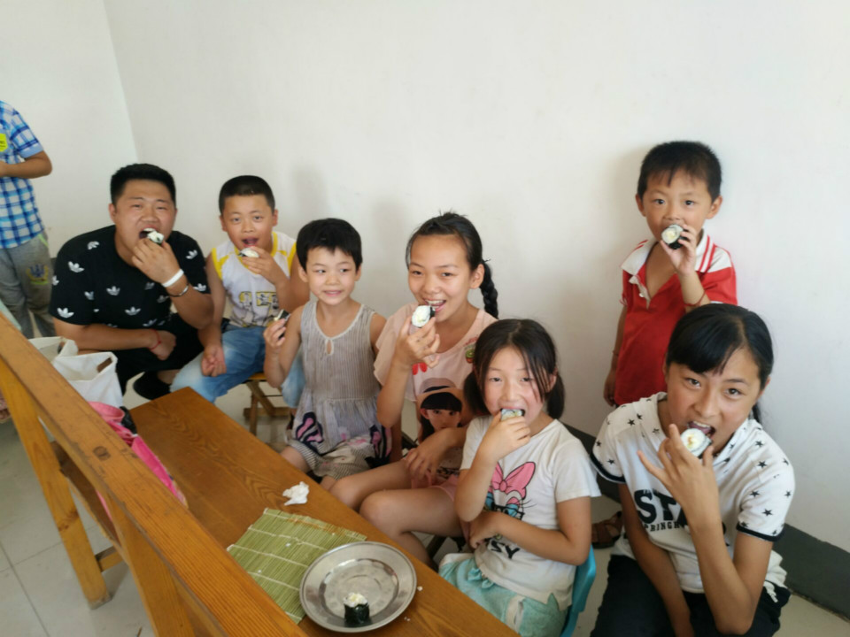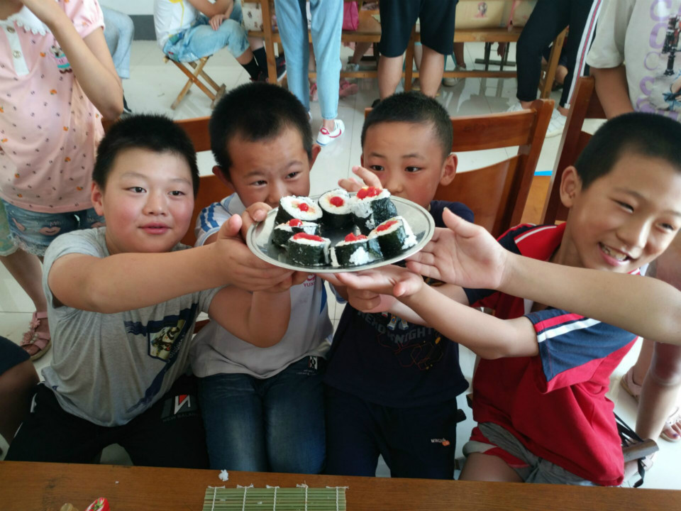 下午,实践团给孩子们上了一节寿司课,在队员们演示的时候,所有的孩子都围着仔细学习,孩子们认真的卷着寿司,却不忘将寿司分给实践队员,孩子们懂得感恩让队员们很感动。