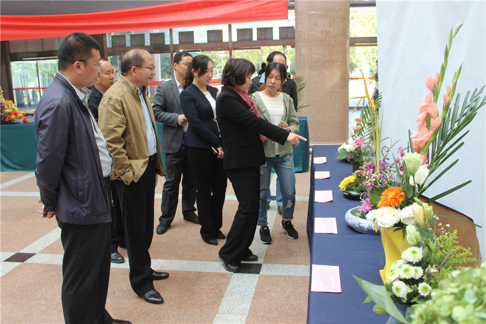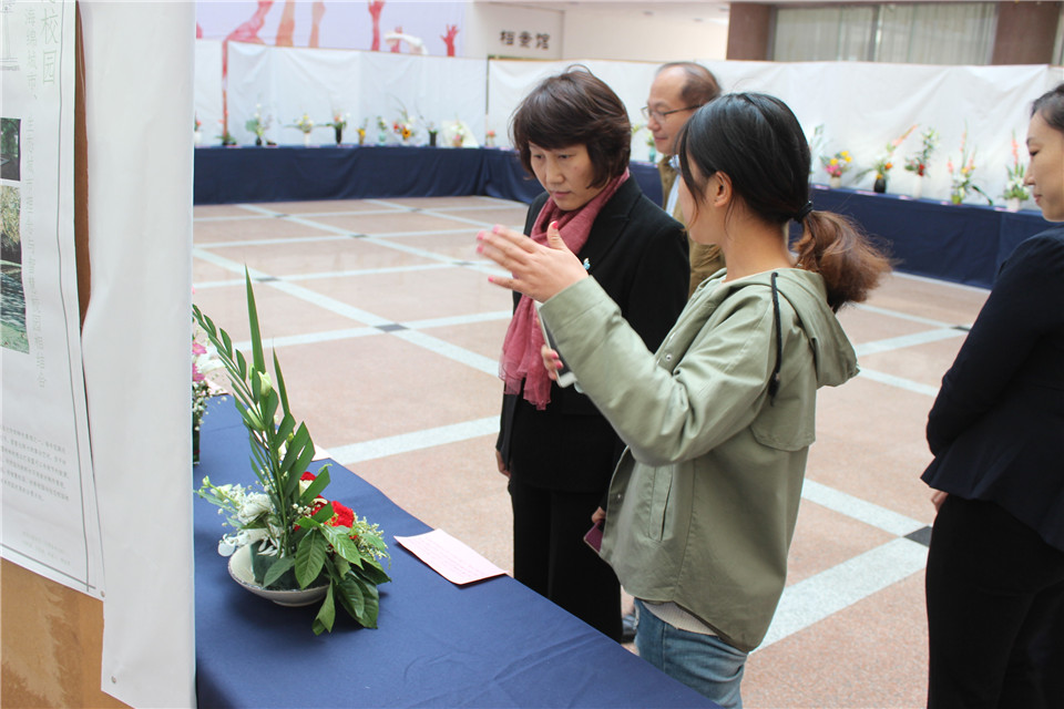 在展台前,刘春霞一行仔细询问着作品的设计理念和寓意以及各种花材的名称和特性,并对同学们的作品赞不绝口。